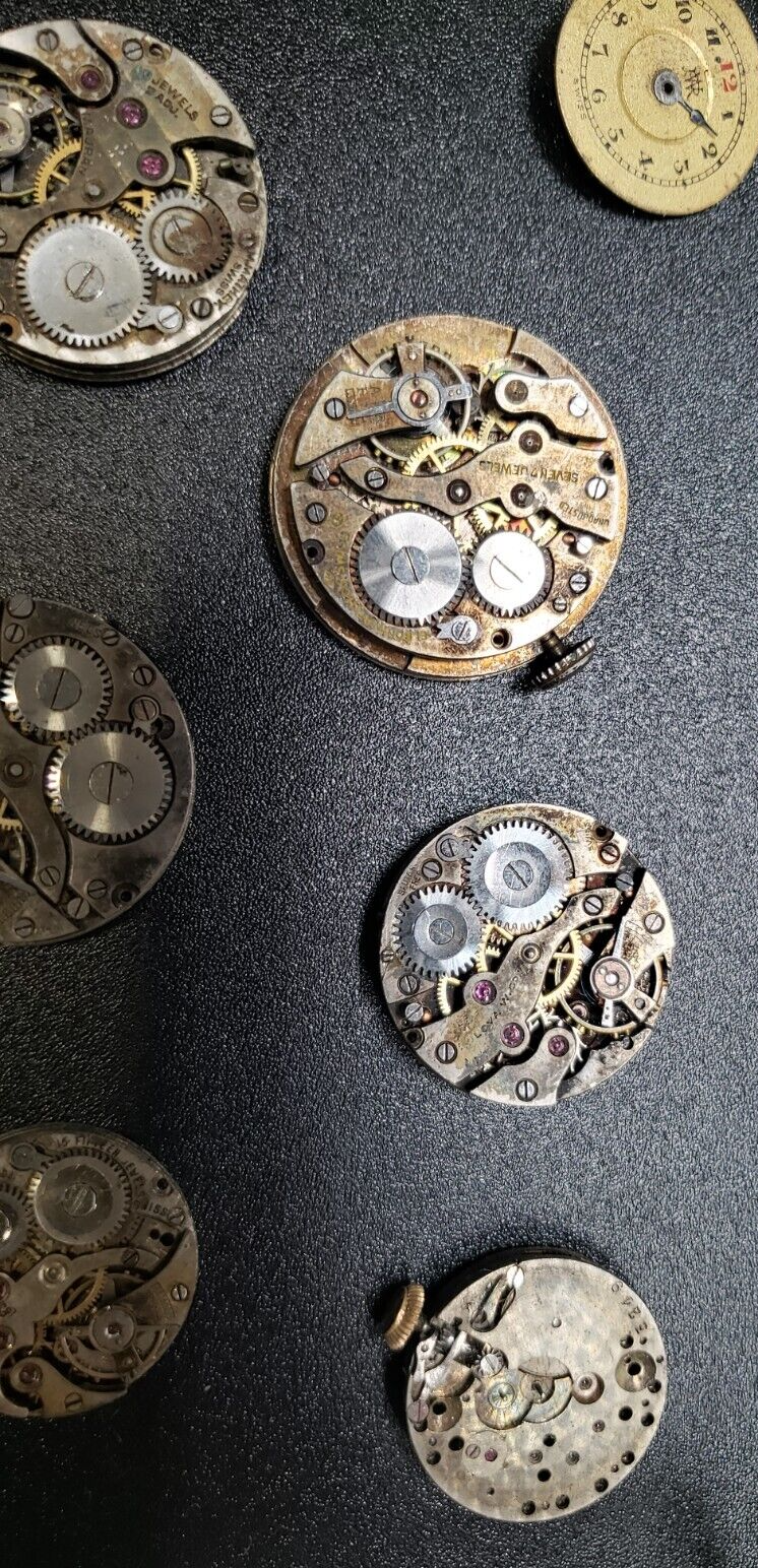 LOT o 11 Vintage Antique 20's 30's Art Deco Watch Movements Bulova Gotham Elbon see condition above. I am not an expert on these. We got a huge supply off a watch maker that went out of business years ago. He had all these movements in this container, as if it was the same timeframe or something. This is nice watch movement lot here. Not sure where the rest of this is. But hopefully you can use this!!!! This should be good lot for watch maker / repairer. this may need to be cleaned up, but does not have scuffs or scratches Please check out my other vintage watch parts and crystal. we have lots of them and more to list. I will give deals on multi-orders!!!! FREE SHIP IN USA