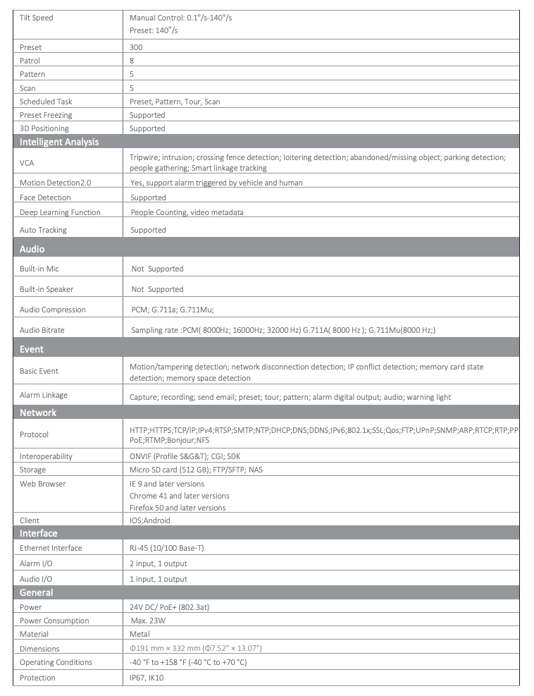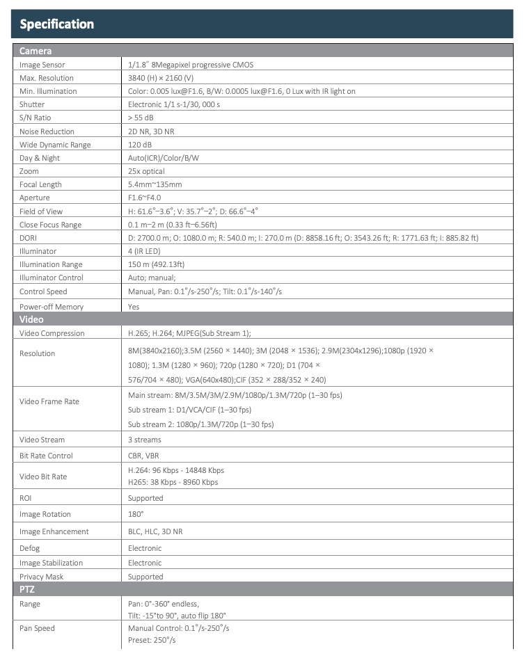 A high-performance 8MP 4K PTZ camera with a 1/1.8? STARVIS? sensor, 25x optical zoom, low-light capability 0.005 Lux 0 Lux with IR, 492ft IR LED, H.265 H.264 smart codec, auto-tracking, face detection, microSD support 512GB, PoE plus 24VDC power, and IP67 IK10 protection.