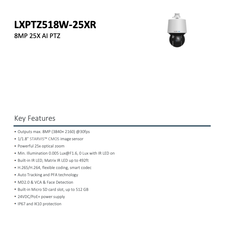 - LXPTZ518W-25XR IP 8MP/4K 25x Zoom 492ft LED Auto Tracking Ai PTZ Dome Camera
