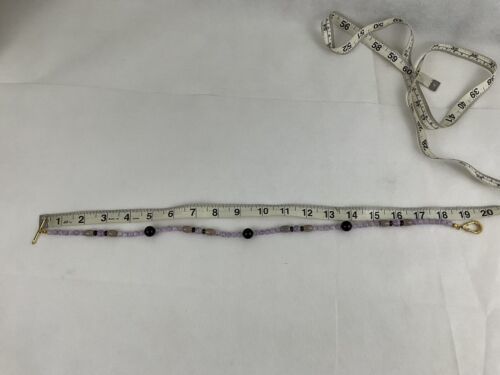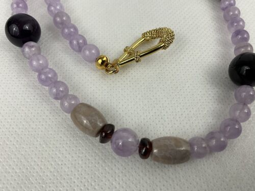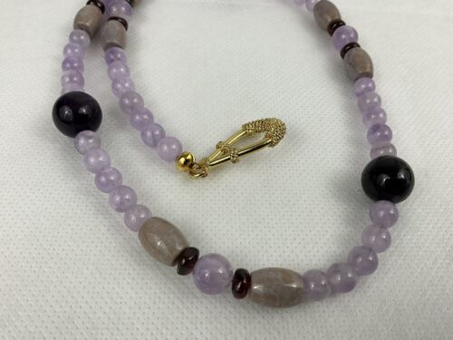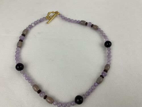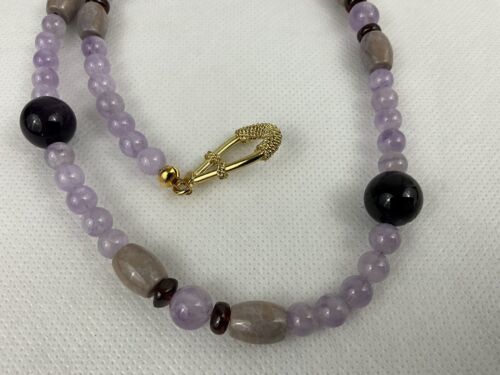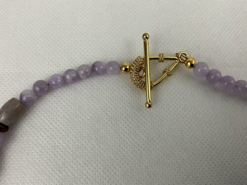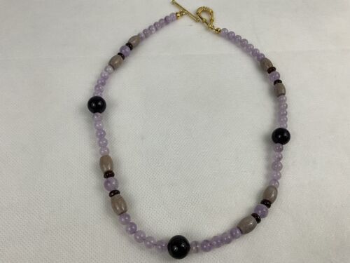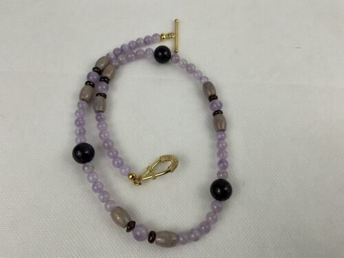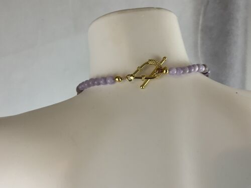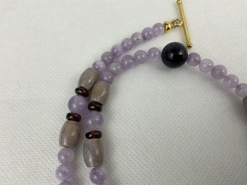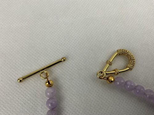 This necklace was made by hand and is a one of a kind. It is composed of a 6mm translucent lavender jade bead strand with four enhancements formed by 2 opaque barrel beads, also of lavender jade, framing an 8mm translucent lavender jade bead, itself framed by two amethyst rondelles, one on either side. The three accent stones are 10mm amethyst beads. It is secured by a metal gold-plated toggle clasp. This necklace is mounted on a gold-colored tiger-tail wire to ensure its security under normal wear. Bead necklace is 18? in length. Natural colored jade and amethyst beads. Made by La ?Opera, jewelry designer.