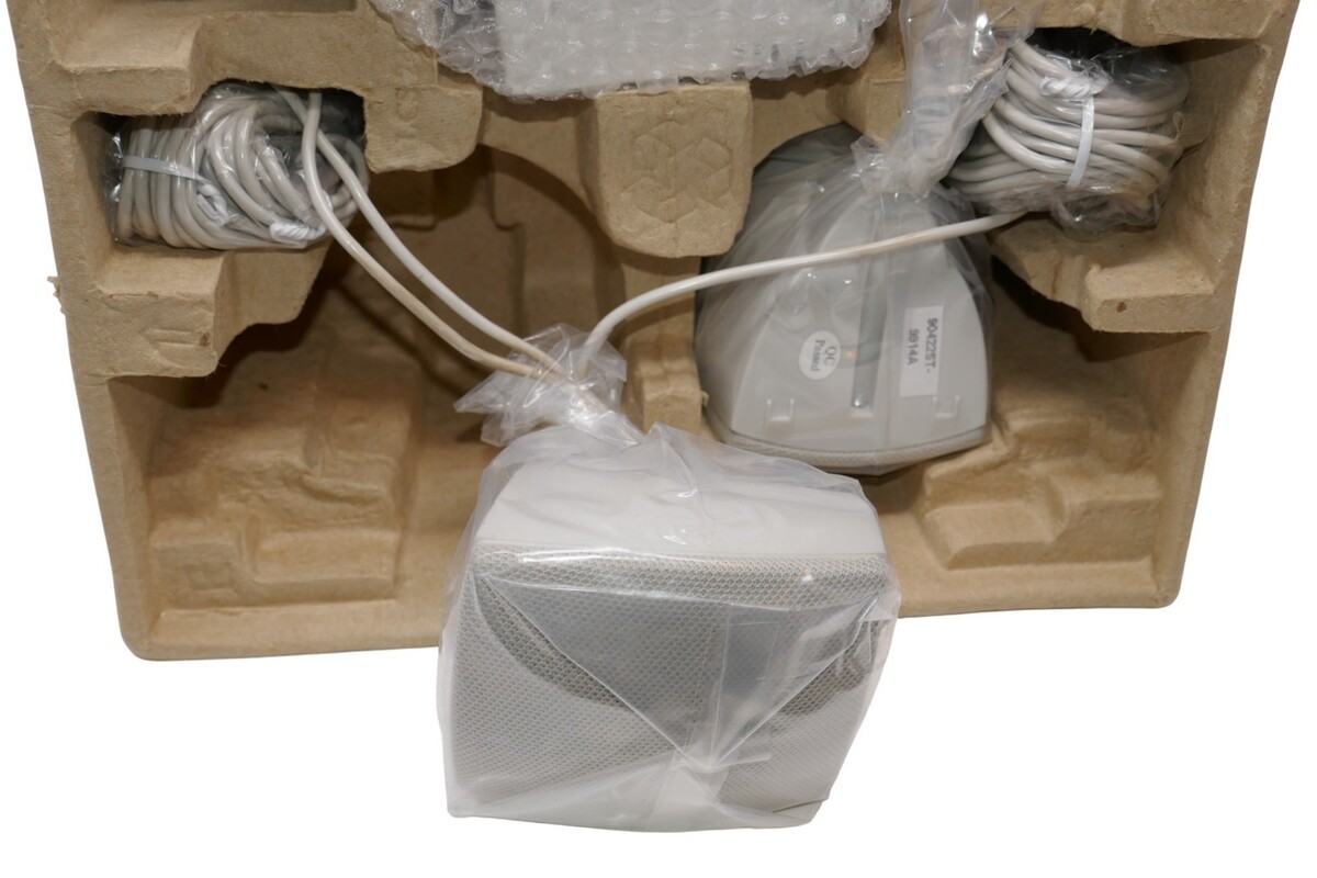 The Labtec LCS-2414 Multimedia Subwoofer Speaker System offers wired connectivity with an audio jack, making it easy to set up and use with computers, laptops, and other devices. This was removed from the box for pictures. The cord has discoloring in areas. The subwoofer system provides deep and powerful bass enhancement for a more immersive multimedia experience. Perfect for enhancing sound quality while watching movies, listening to music, or working on a desktop computer.