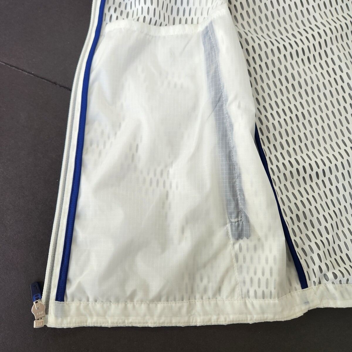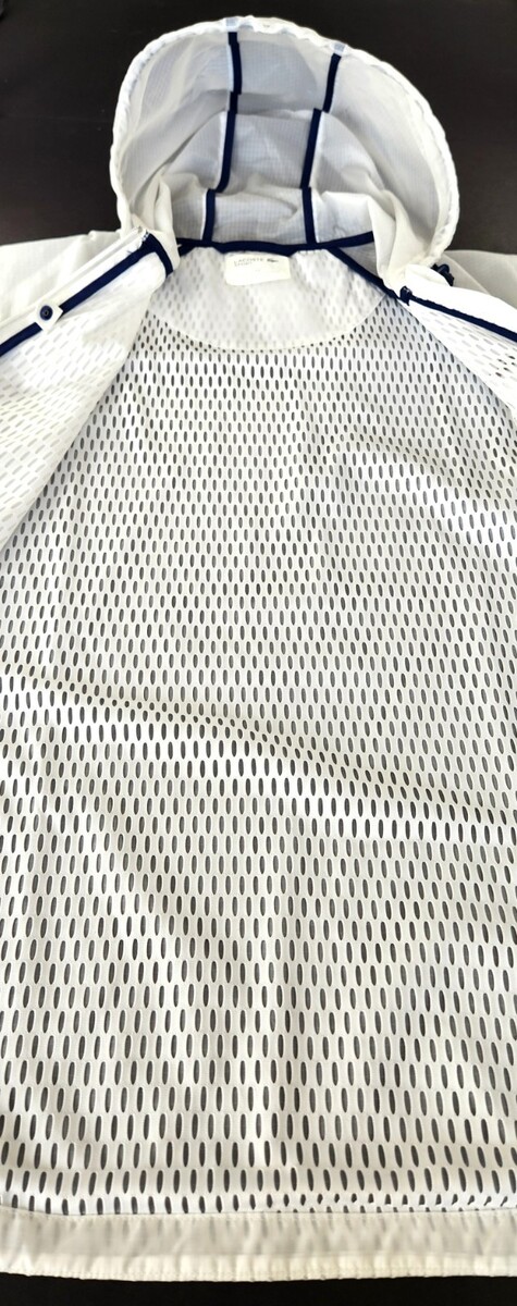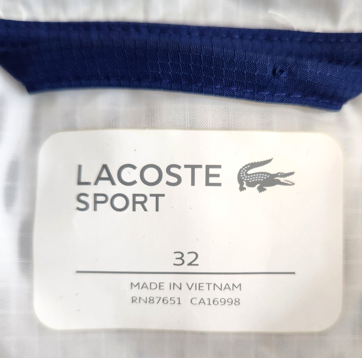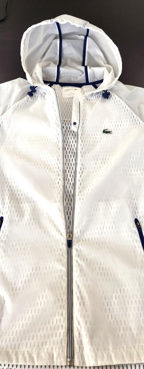 The product is a stylish Lacoste Sport French Designer Croc Hooded Windbreaker Rain Jacket in size XS for women. Made from polyamide with a solid white color, blue trims throughout and featuring the iconic crocodile logo accents, this jacket is perfect for activewear occasions.