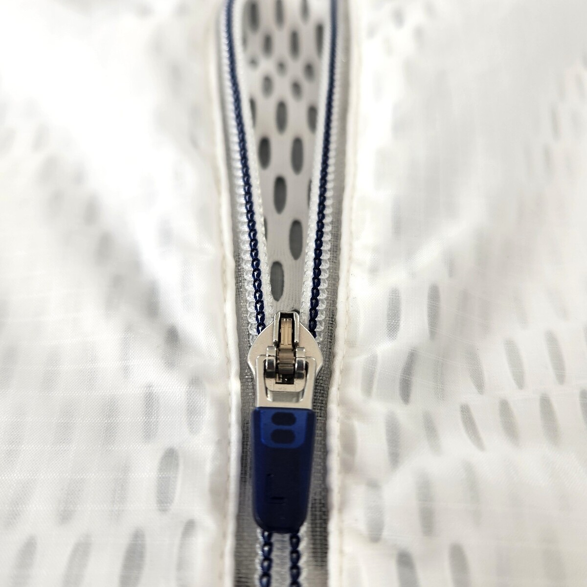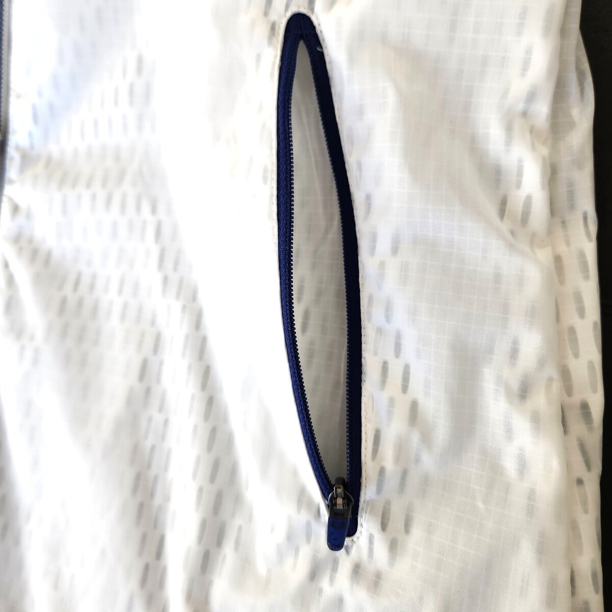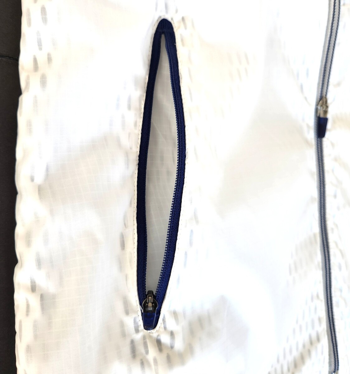 The product is a stylish Lacoste Sport French Designer Croc Hooded Windbreaker Rain Jacket in size XS for women. Made from polyamide with a solid white color, blue trims throughout and featuring the iconic crocodile logo accents, this jacket is perfect for activewear occasions.