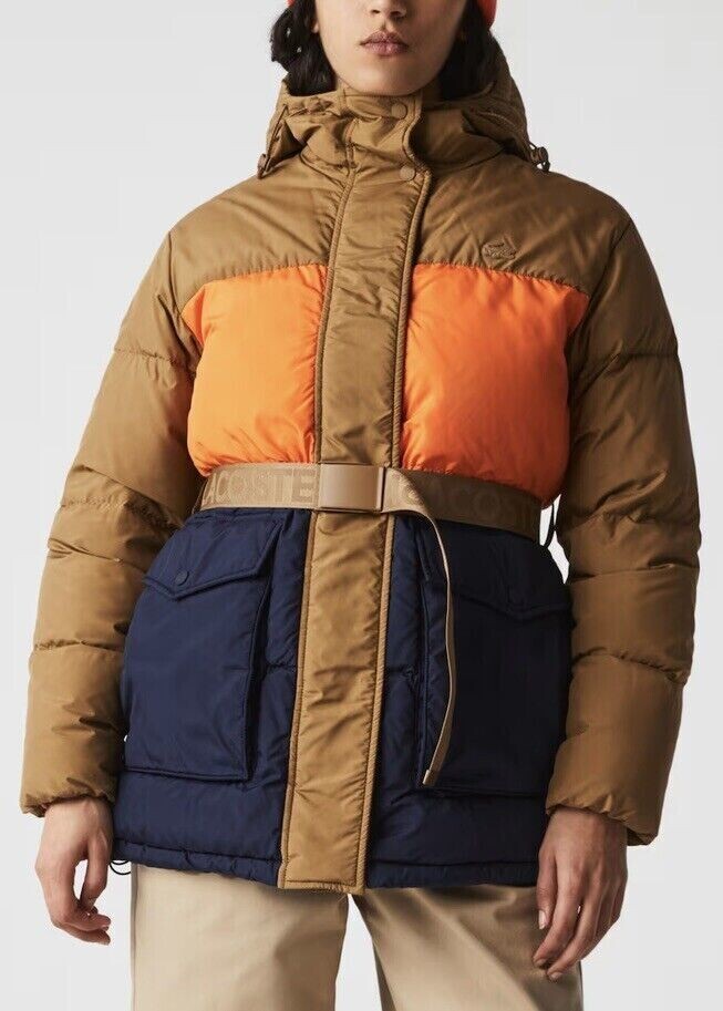 - Lacoste Women’s Hooded Belted Colorblock Quilted Jacket- Sz 40-8 OJ/BRWN NWT