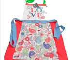 This cute Indie Love Apron features a digital Lettered colorful design, LOVE, on a white background with a paisley print material over a dark pink skirt. Blue waist tie with bright pink buttons and an adjustable lime green neck tie. 26.75 x 37 inches. Machine wash tumble dry low. Do not dry clean.