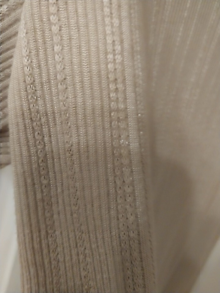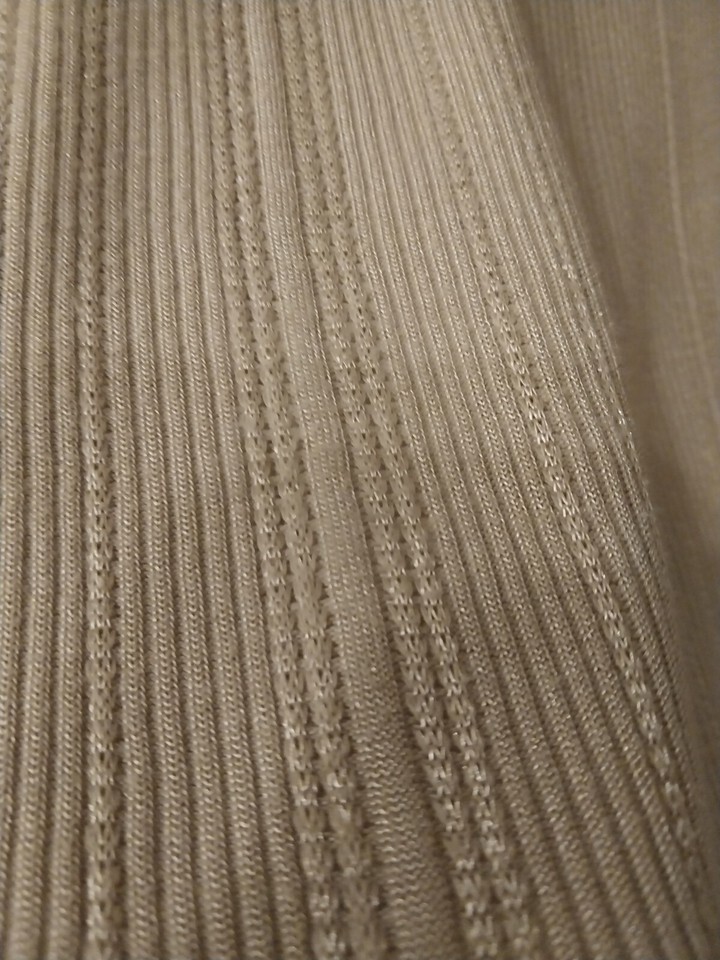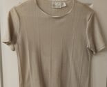 This ladies top from the Kathie Lee Collection is a must-have addition to your wardrobe. With a beautiful beige color and short sleeve design, it is perfect for any casual occasion. The round neckline and basic style make it easy to pair with jeans or a skirt. It is 18.5 inches from the middle of the neckline to the bottom. Made from a comfortable polyester blend material. I tried to get a picture to show that it is shiny and ribbed This top is in excellent condition and has never been worn. It comes in a size small and is ideal for women of all ages. Add this stylish top to your wardrobe today.