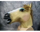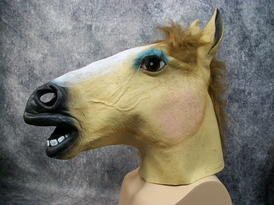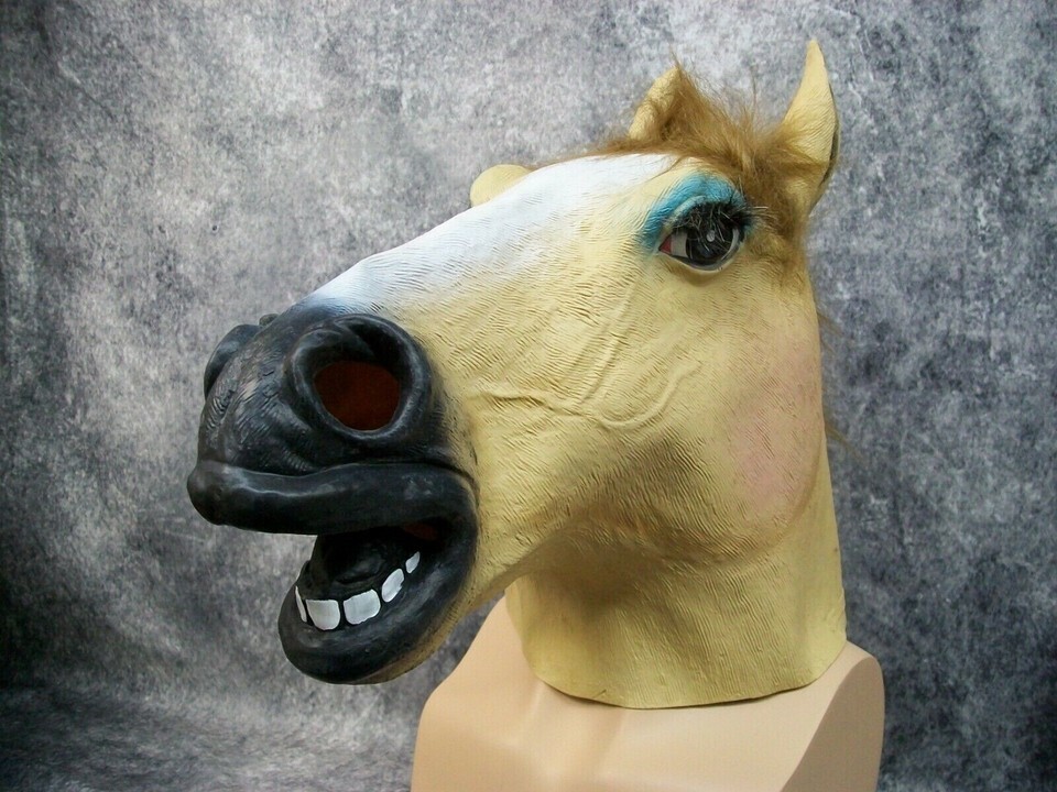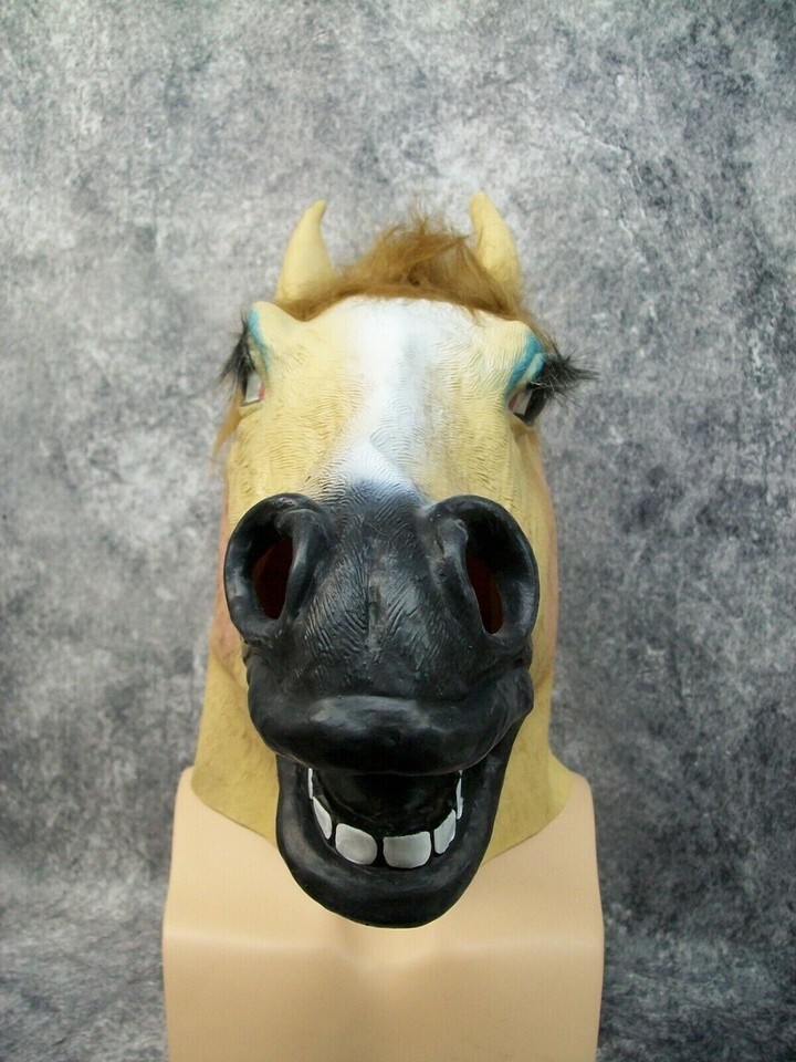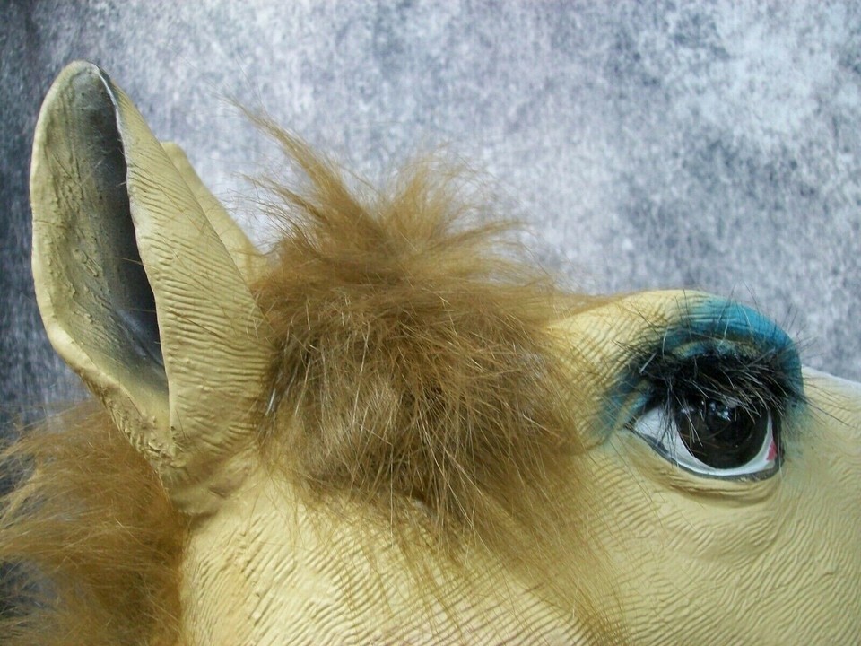 Tan Horse Costume Mask. Nice detail. Great for a horse, couple, or farm themed costume. One Size Fits Most. For ages 14 and up. Lightly warm with hairdryer to relax any creases. I believe this is real latex so beware if you have allergies to latex products.