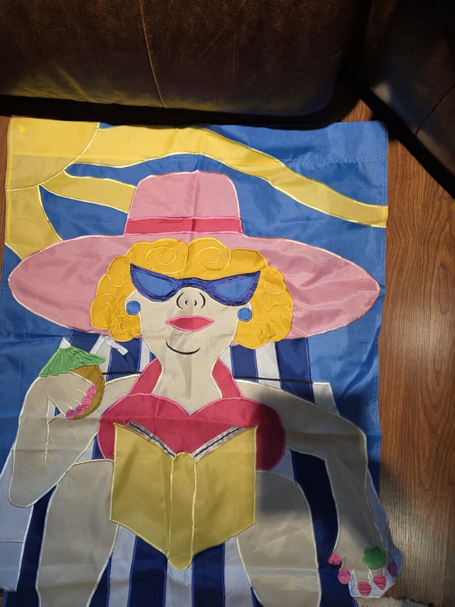 Lady in Beach Chair Flag Read Book Drink Umbrella Streamers Fish Seahorse 27x70