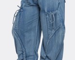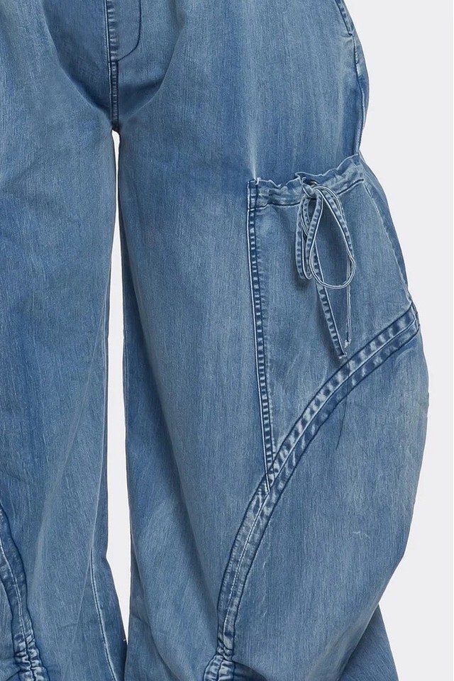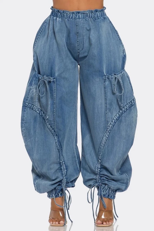 - Lagenlook Artsy Plus Size Blue Ruched Jogging Denim Cargo Jeans Ties Cut to Size