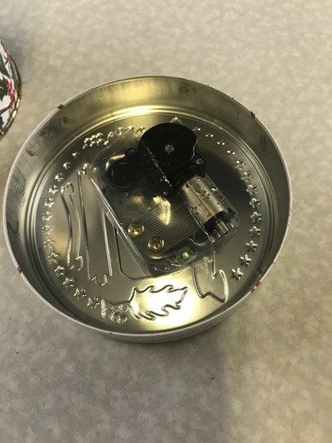 Excellent condition. A few minor scuffs on outside of tin. Music box works but seems to be a little fast. Please see pictures for details and measurements.