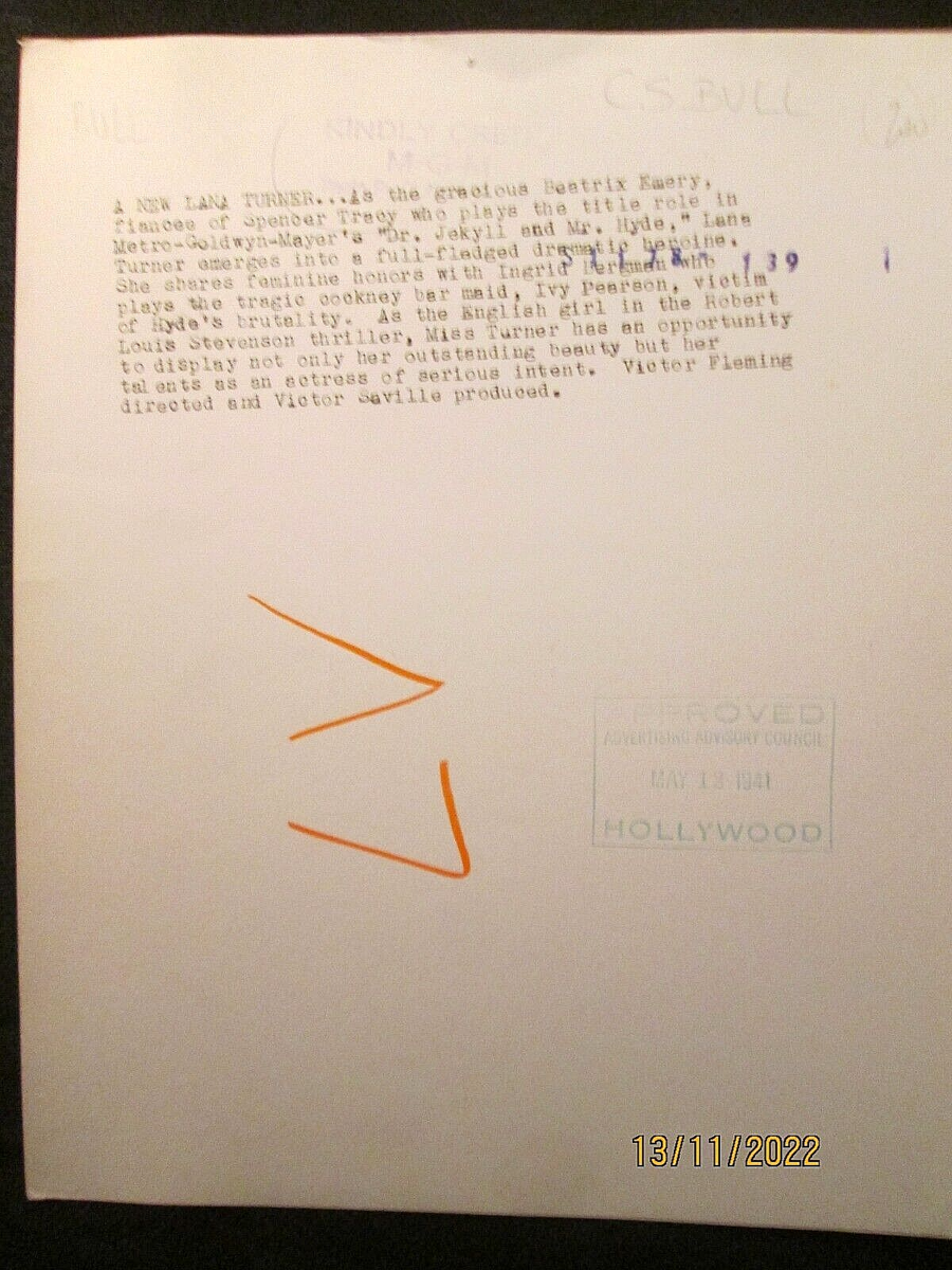 LANA TURNER : (ORIGINAL VINTAGE COLLECTION) CANDIDS,SEXY,MOVIES,CLASSIC (ORIG,CLARENCE BULL PHOTO) STAMPS ON BACK OF PHOTO