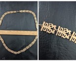 Diese 35 Zoll lange Halskette aus chinesischem Messing ist mit einem Langlebigkeitssymbol versehen, was sie zu einem inspirierenden und einzigartigen Vintage-Schmuckstück macht. Die Goldfarbe und der gute Schliffgrad verleihen der Halskette einen Hauch von Eleganz, was perfekt für Frauen ist, die ihrer Kollektion ein Statement-Stück hinzufügen mochten. Das Messingmaterial sorgt für Strapazierfahigkeit und Langlebigkeit, wahrend das Fehlen eines Hauptsteins das Design der Halskette in den Mittelpunkt rückt. Insgesamt strahlt dieses Originalstück einen Sinn für antiken Charme und zeitlosen Stil aus.