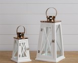Here is a new pair of lanterns and are made of wood, glass and iron metal, they each have a white finish wood trim and glass around the sides and the tops are metal with a rose gold finish and each has loop handle, They have a latch on front doors so can open and close and put your favorite candle or greens inside, candle and greens NOT INCLUDED,The larger one measures 16.75" H x 8.75" W x 7.75" D and the smaller one measures 10" H x 5.75" W x 5.75" D, nice pair of lanterns and i have on sale at a great price, they sell for over $125 regularly, and check out my other lanterns i carry and lighting and decor