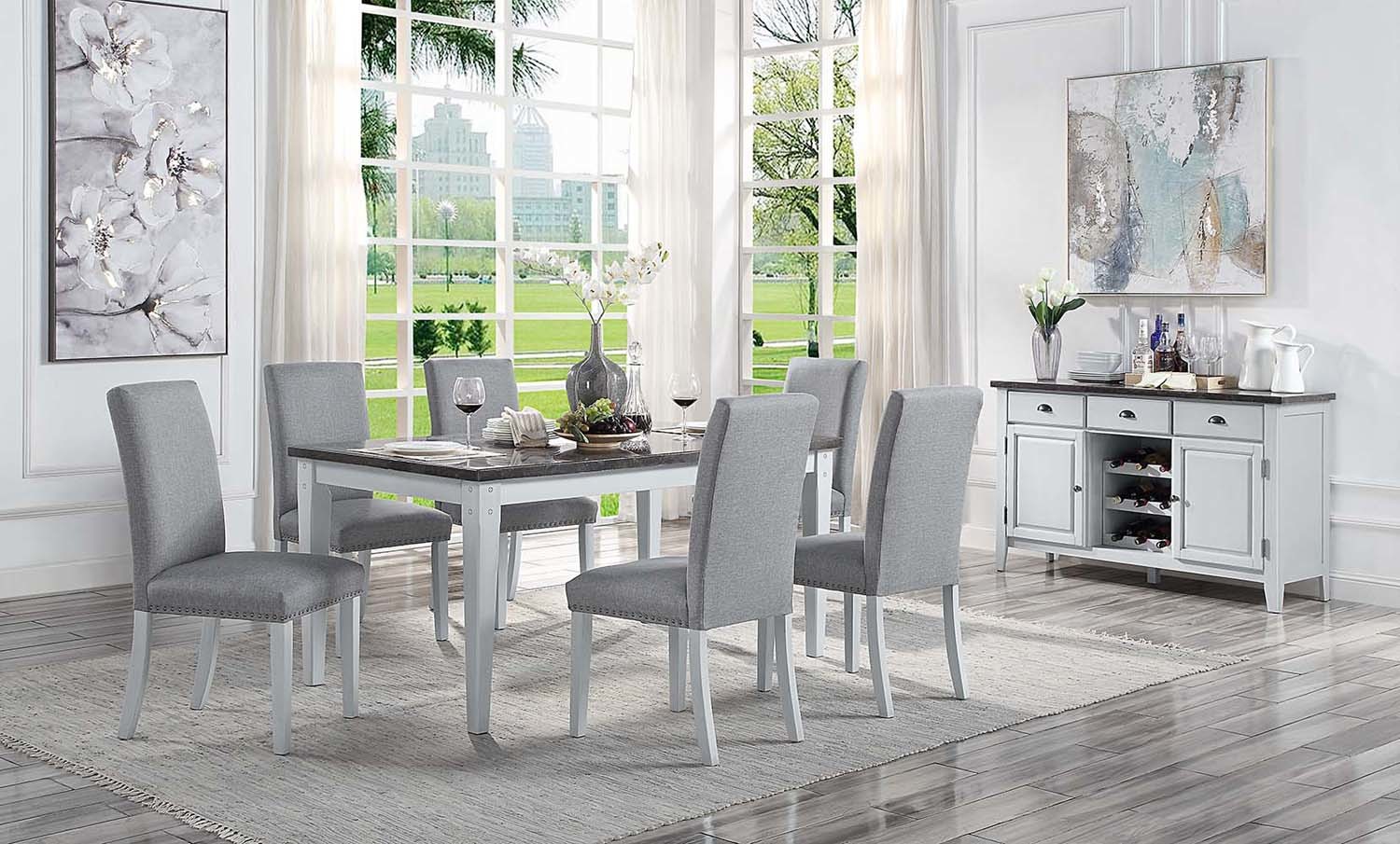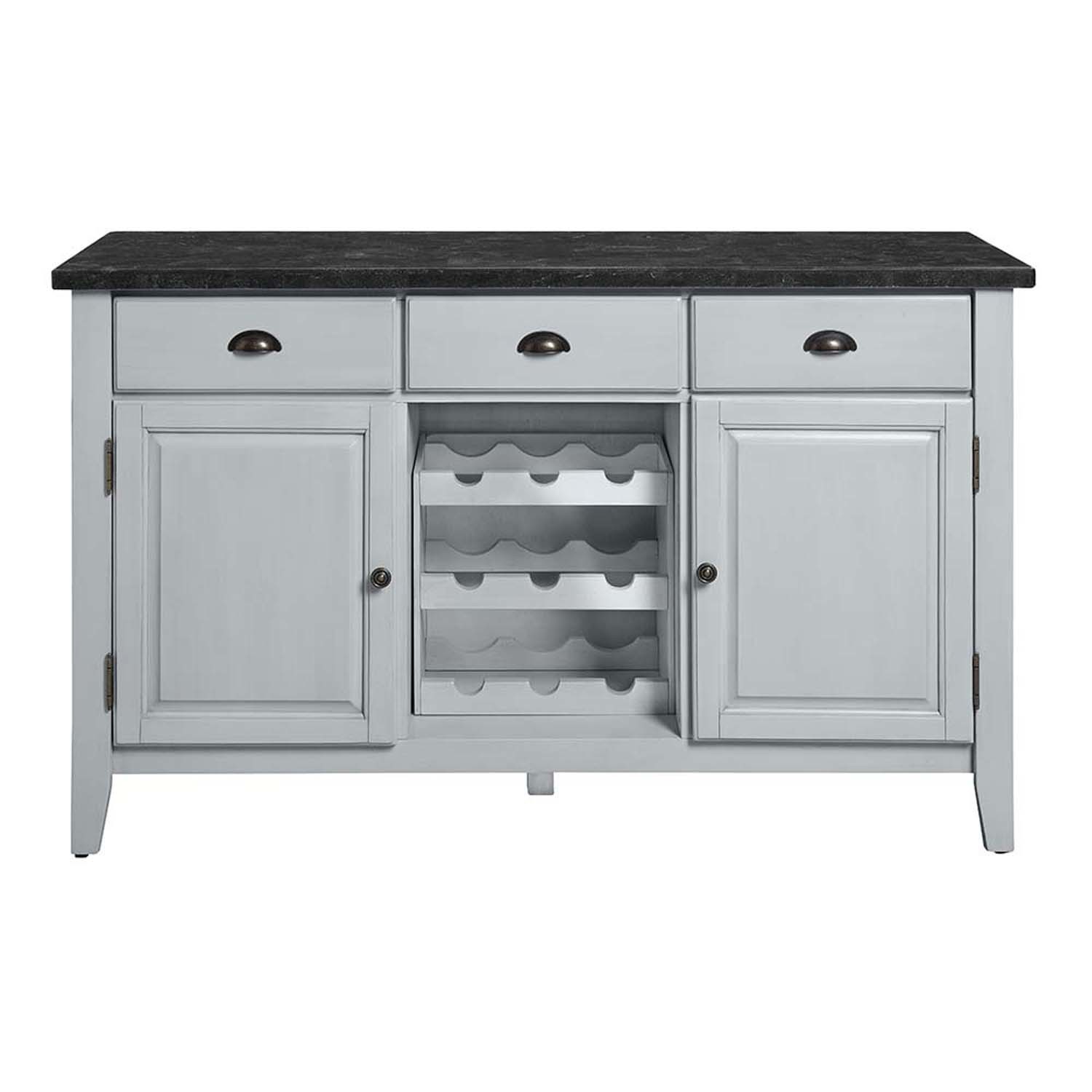 Upgrade your dining space with this exquisite Lanton server and enjoy the convenience of having everything you need at your fingertips while adding a touch of timeless beauty to your home. Whether it's hosting a dinner party or simply organizing your dining essentials, this server with a natural marble top, antique white finish, three drawers, a wine rack, and two side cabinets is a versatile and stylish addition to your dining room. Its combination of elegance, storage options, and durable construction make it a standout piece that effortlessly merges form and function. The antique white finish of the server brings a sense of timeless beauty and vintage charm to your dining area. It effortlessly complements various interior styles, creating a warm and inviting atmosphere. The server's natural marble top adds a touch of sophistication and refinement to the overall design. The smooth and polished surface provides an exquisite platform for serving and displaying items, while also offering easy cleaning and maintenance.
