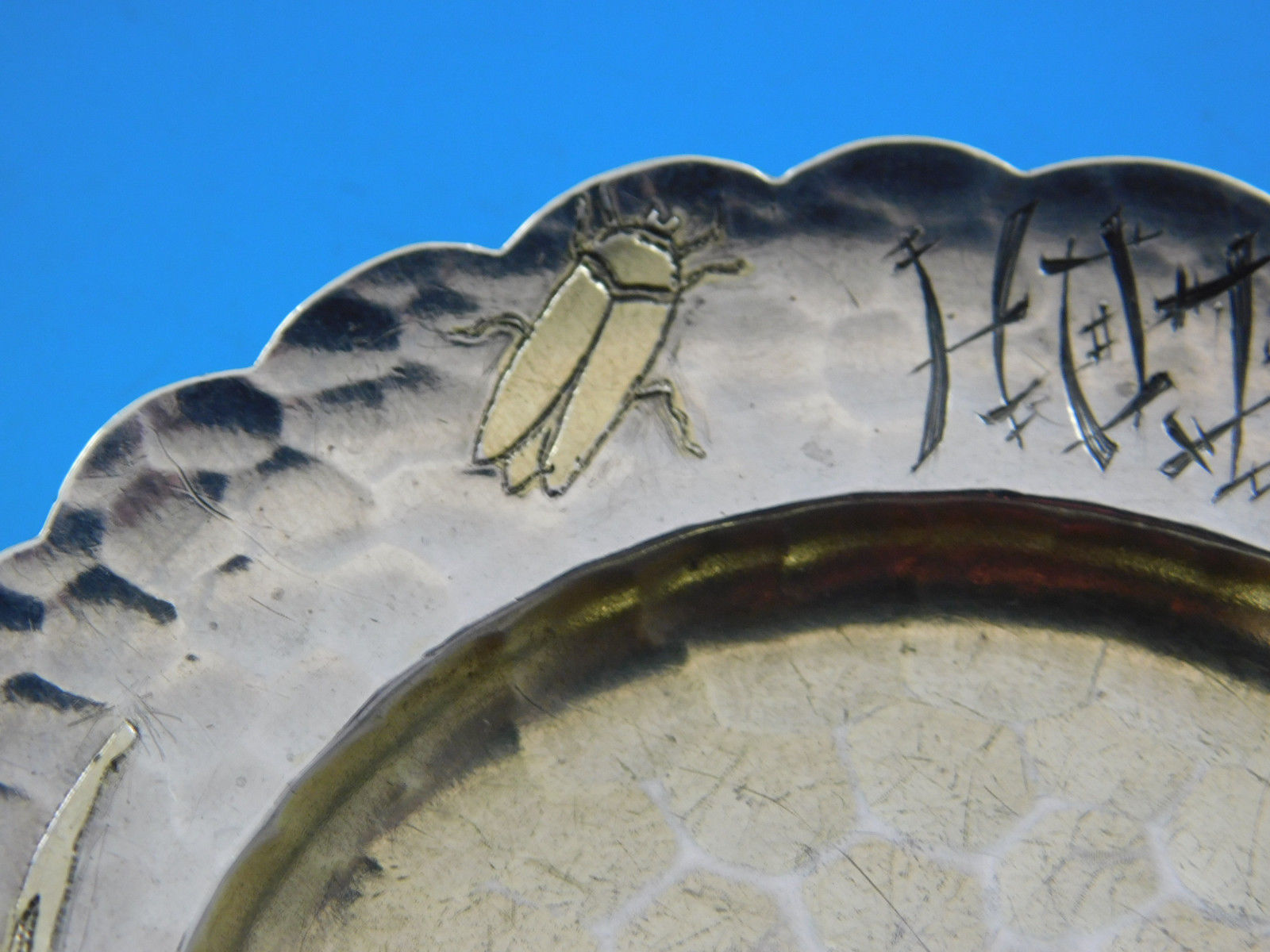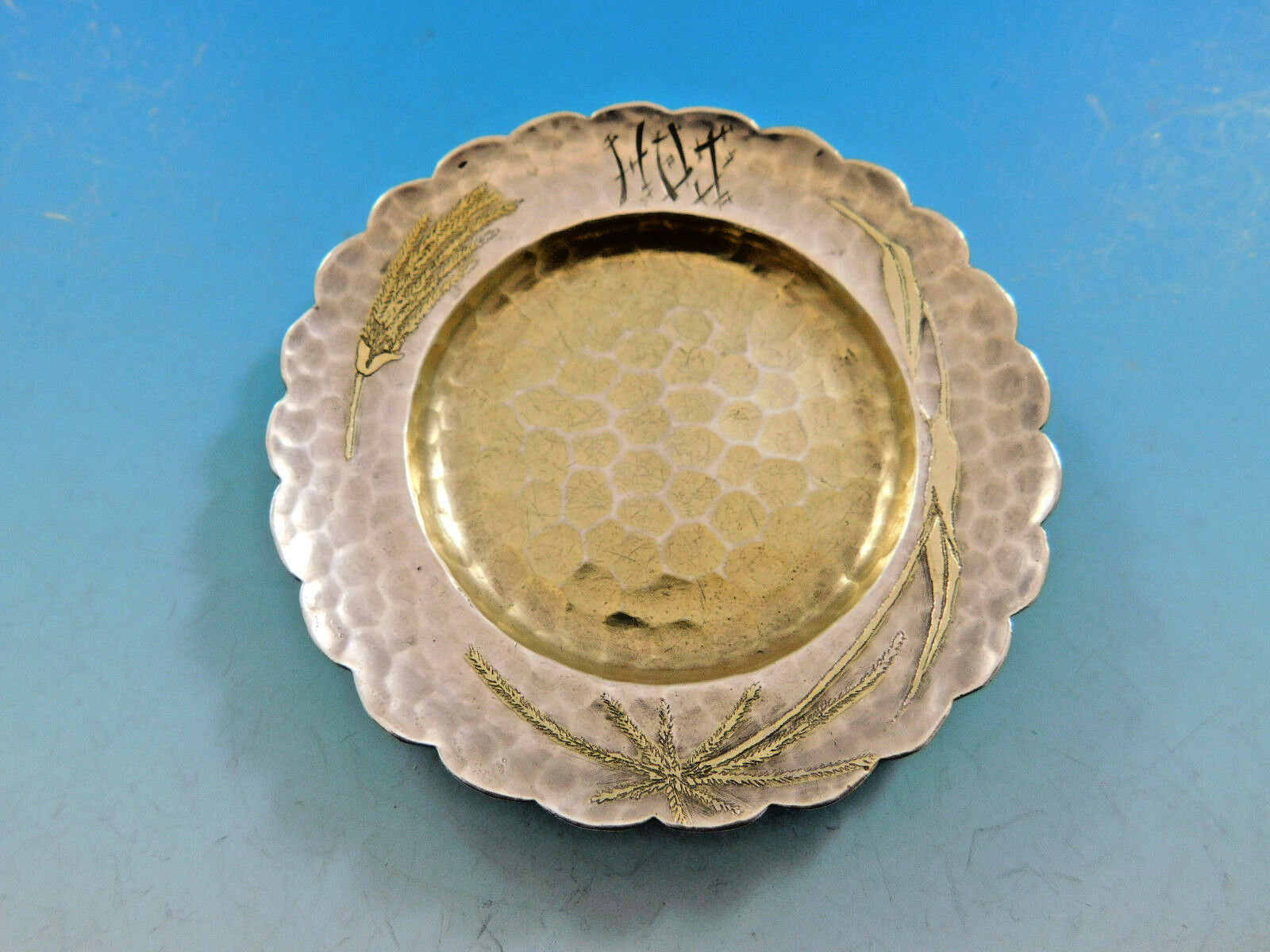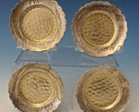 This outstanding set of four sterling butter pats was made by Tiffany Co. in the pattern "Lap Over Edge". They are hand hammered, acid etched. and partial gilt featuring aesthetic elements including butterflies, cattails, and a beetle. Stamped with the date letter "M" circa 1880, and the #6265/2937. They measure 1/4" tall, 3" diameter, and the set weighs 4.8 ozt. They are in excellent condition with vintage monograms (see photos). Museum quality.