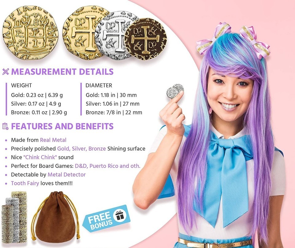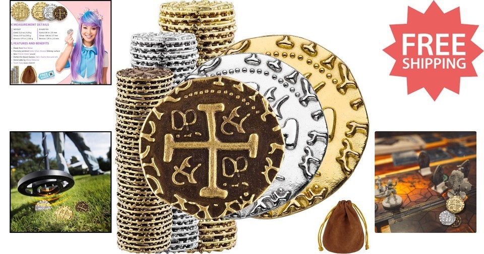 Elevate your gaming, parties, and cosplay with our versatile set of realistic metal coins. Perfect for enhancing board games like Dungeons and Dragons or Age of Empires, these coins add an authentic touch that enriches your experience. Ideal for pirate-themed events, our bronze, silver, and gold coins serve as stylish accessories, collectible treasures, or exciting hidden objects for treasure hunts. Crafted from zinc with a shiny finish, each coin produces an authentic "cha-ching" sound, making your adventures more immersive. The set includes 102 coins in various sizes, complemented by a convenient pirate coin pouch?perfect for bringing your pirate fantasies to life! To ensure fast and reliable delivery, we work with multiple fulfillment partners and suppliers. Depending on availability and location, your order may ship from different warehouses or arrive in packaging that varies from item to item. Tracking details are typically provided shortly after shipment, and customer satisfaction remains our top priority. Please note that due to carrier policies and regional regulations, certain items may not be eligible for delivery to specific states or territories.