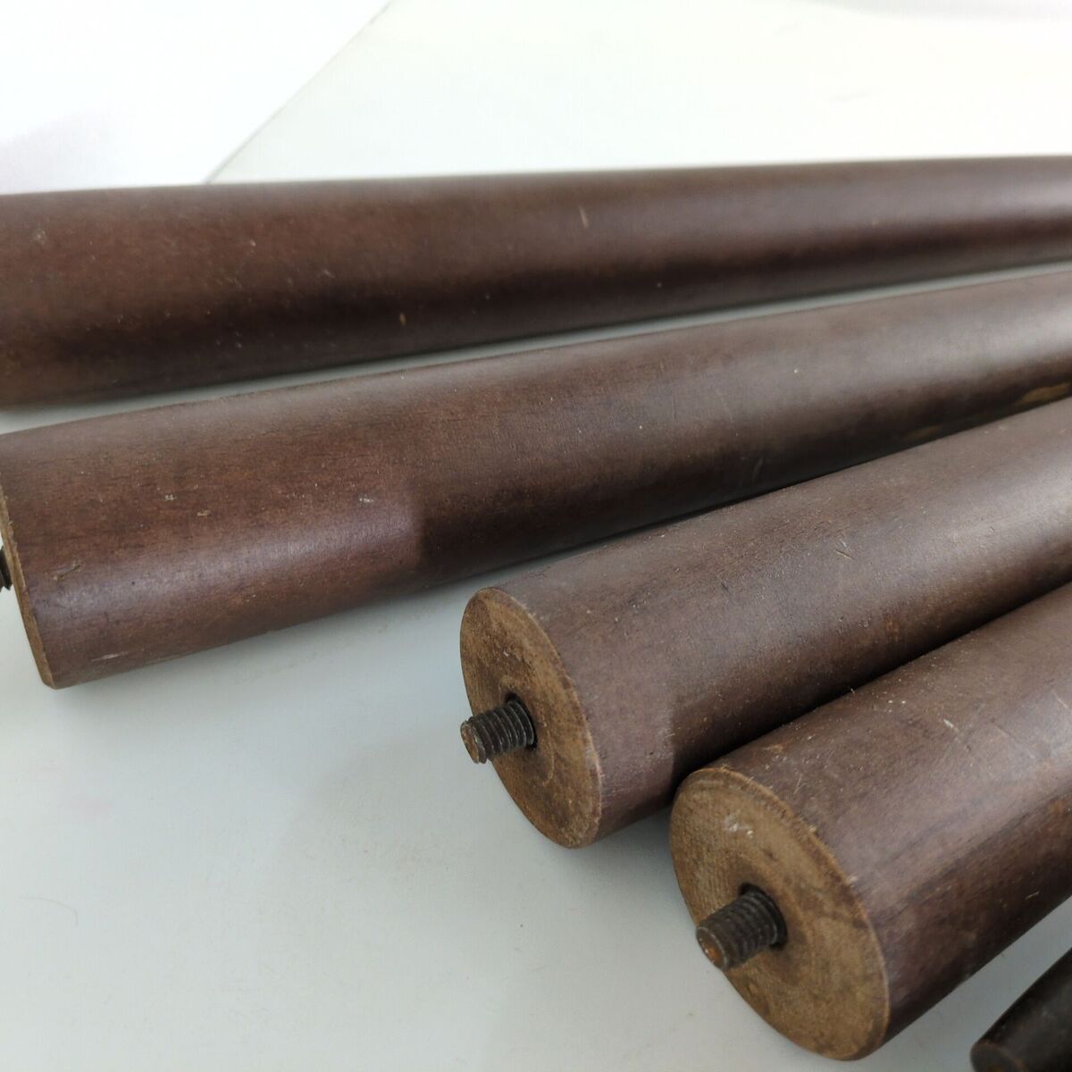 -12x 8" Spindle-like brown stained legs, rounded end, hole at top for a peg or perhaps screw
