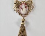 Large Cameo Brooch, Snake Accent Gold Tassel Pin