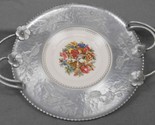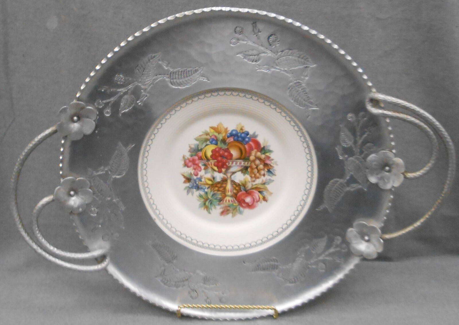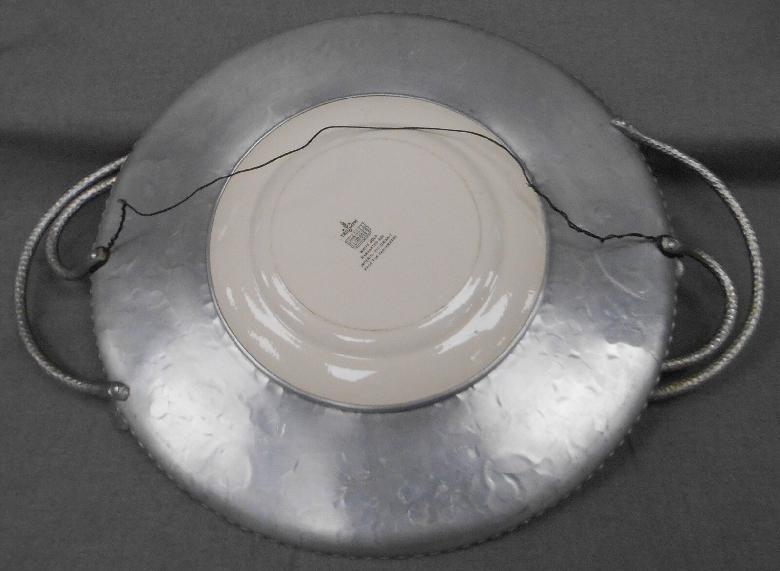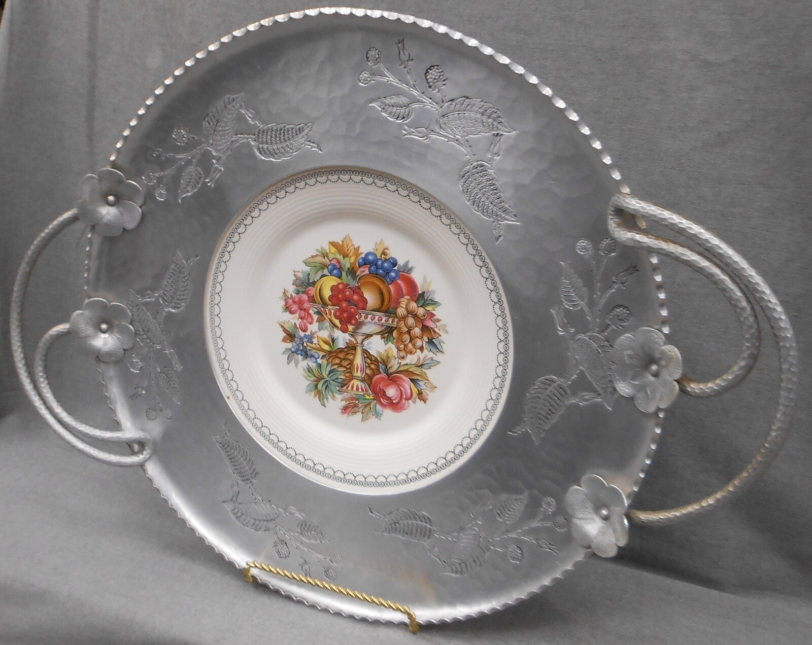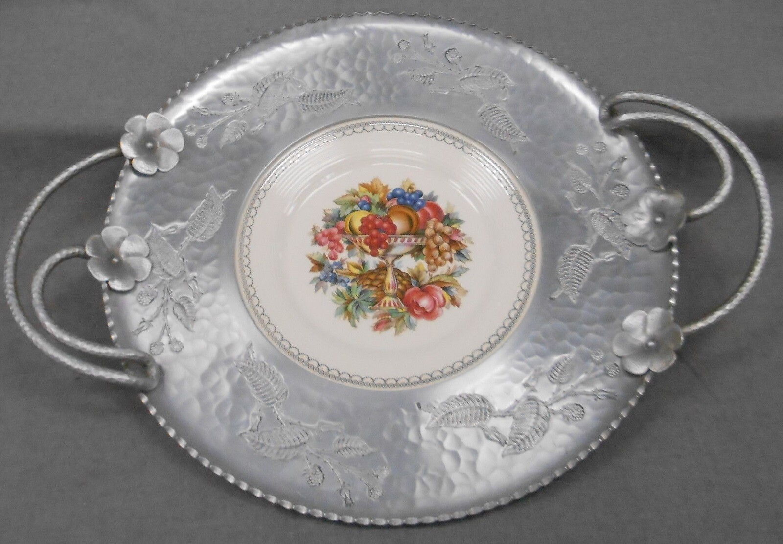 This is a large Wrought Aluminum Tray w/Handles from Farberware of Brooklyn, New York that measures approx. 16 1/" in diameter and 21 3/4' from handle to handle. The inner ceramic plate with the Fruit Compote Motif is from Triumph in their Limoges White Gold Imperial Victorian Pattern and the plate measures approx. 9 1/2" in diameter and is free from chips or damage. The tray displays nicely and in overall great vintage condition and has a wire on the back attached for hanging if desired.