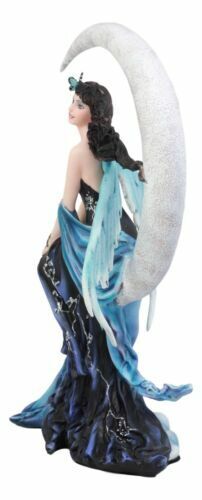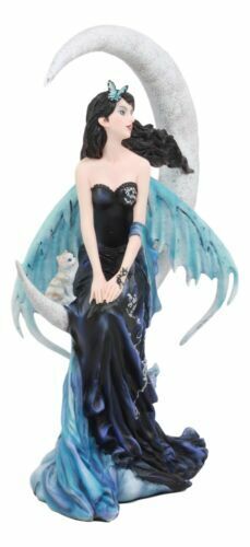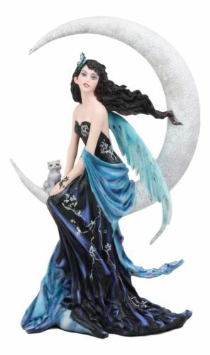 ? This lovely figurine by Nene Thomas will enchant all who gaze upon it! A beautiful fairy woman perches upon the cresent moon, her dark hair billowing out behind her. She wears a dress of deep indigo blue-purple, embroidered with silver thread. A little kitten friend keeps her company as she gazes off into the stars.
