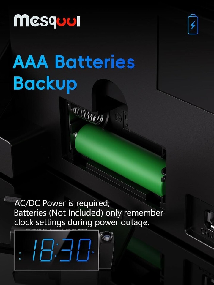 Features: Battery Backup,Large Display,Projection,Snooze,Loud Dual Alarms,5-Level Dimmer,USB Charger,Adjustable Volume,Daylight Saving Time (DST),Adjustable Brightness