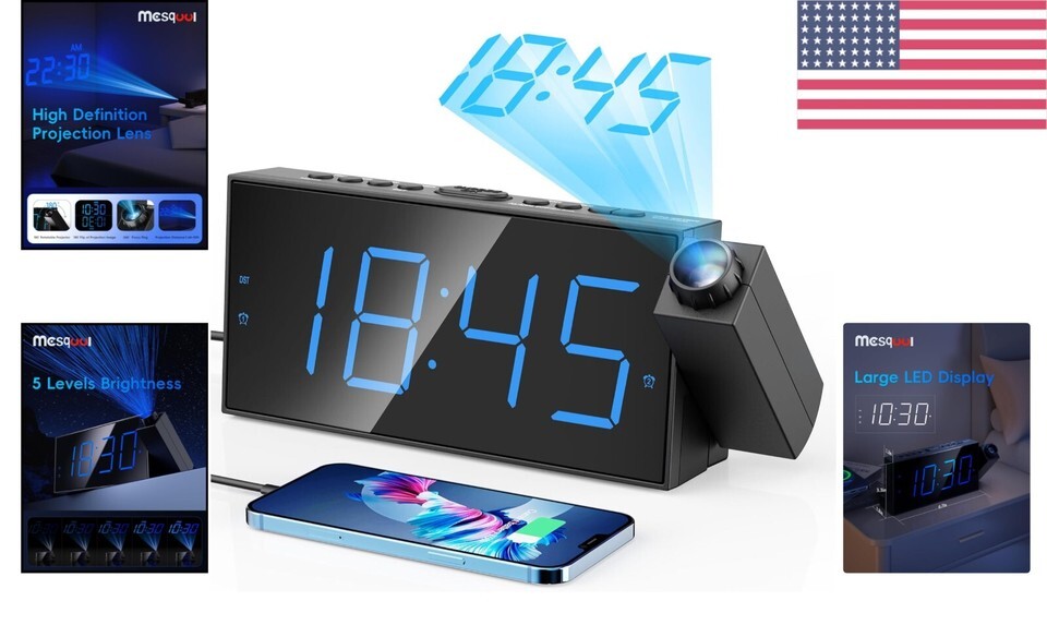 - Large LED Projection Alarm Clock with 180° Rotatable Projector & USB Charger