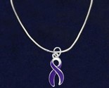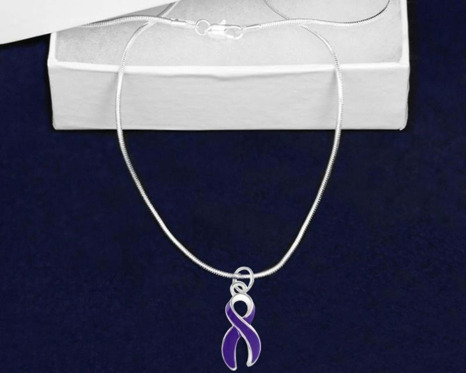 Large purple ribbon necklaces have a large purple ribbon charm on a sterling silver plated snake chain that has a lobster clasp. Charms is approximately1" tall.