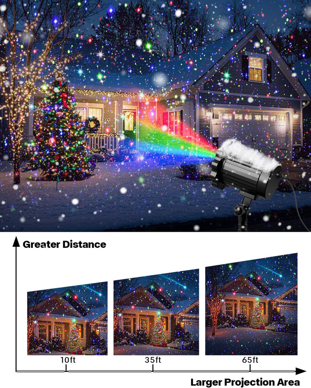 ?Larger Projection Area?The projection distance of the laser light is 9.8ft-65ft, and the projection area is enough to cover your courtyard or the entire exterior wall of the house. While other laser lights on the market have a maximum projection distance of only about 40ft, our light can project a larger area. The light head can also be rotated and adjusted 180, so you can adjust the most suitable distance and angle to obtain the best projection effect.