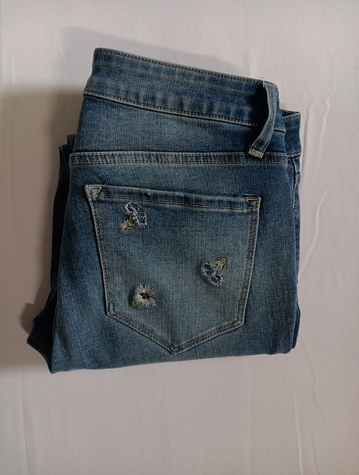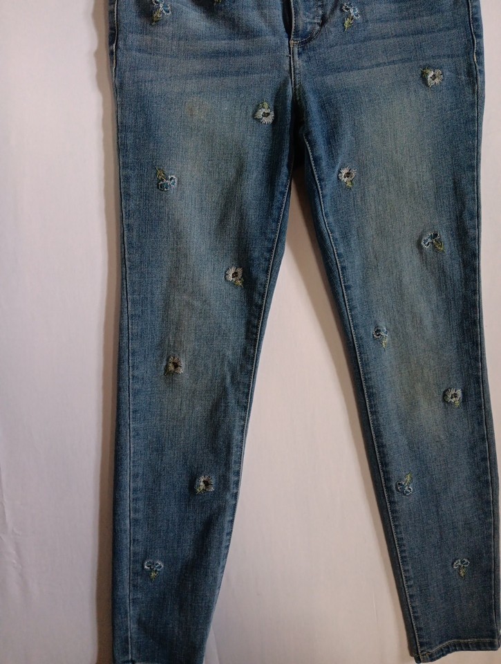 The Lauren Conrad Jeans in size 8 feature floral embroidery on light blue denim, giving them a unique and fashionable look. With a super skinny fit and zipper accents, these jeans offer a stylish and flattering silhouette for women. The regular size type and denim fabric make them comfortable for everyday wear, while the flower theme adds a touch of springtime flair to any outfit. Perfect for pairing with sandals or heels for a trendy casual look. Normal wear.