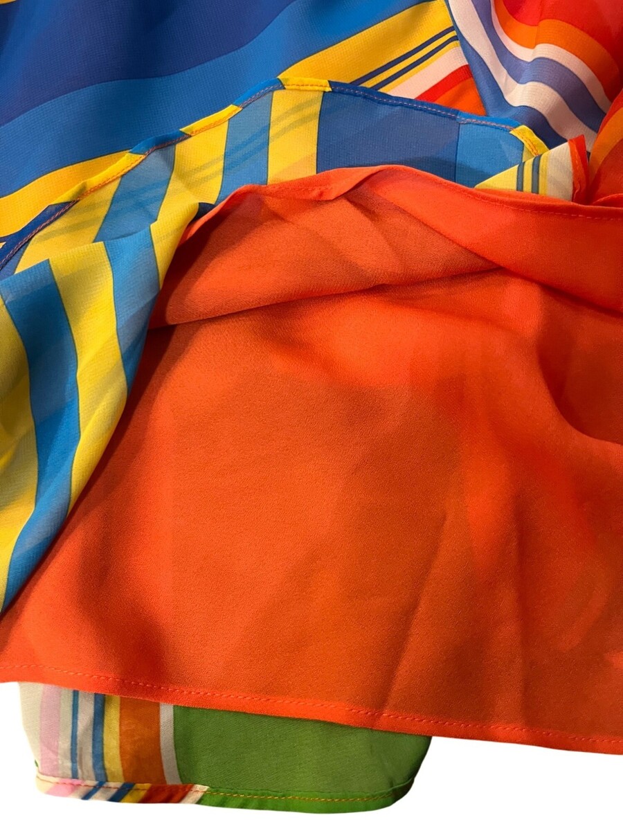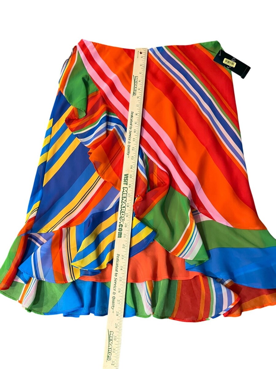 lauren ralph lauren, ralph lauren skirt, womens medium, ruffle hem, striped skirt, colorful, asymmetrical skirt, midi skirt, polyester, summer skirt, resort wear, vacation style, bright multicolor, pull-on skirt, new with tags, boho chic, beach outfit, vacation, casual, night out