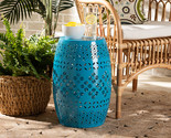 Establish a cozy corner in your backyard with the Layton side table. Made in China, this table is constructed from solid metal presenting a cool blue finish. Intricate cut-outs on the sides of the table create a chic, geometric display while allowing light to pass easily through its frame. The Layton will arrive fully assembled and features a barrel shape for excellent stability. A perfect pedestal for outdoor decorations, the Layton side table creates a lovely scene in any patio or deck area.