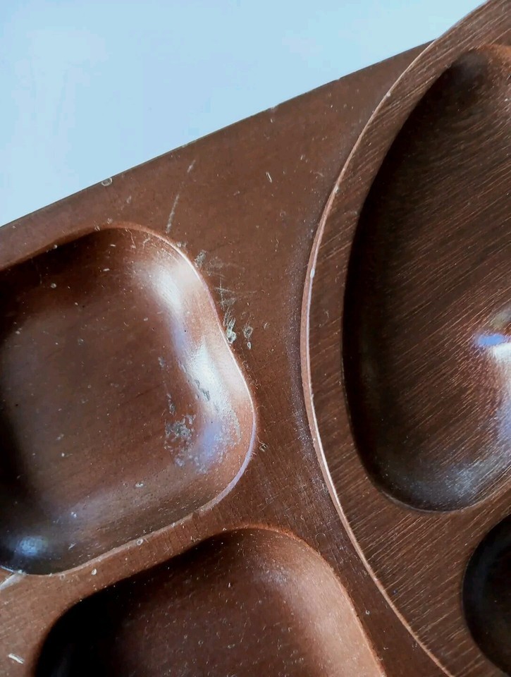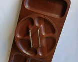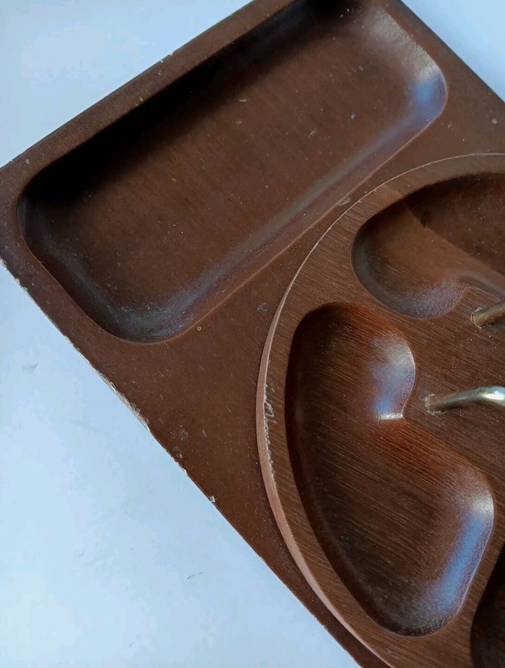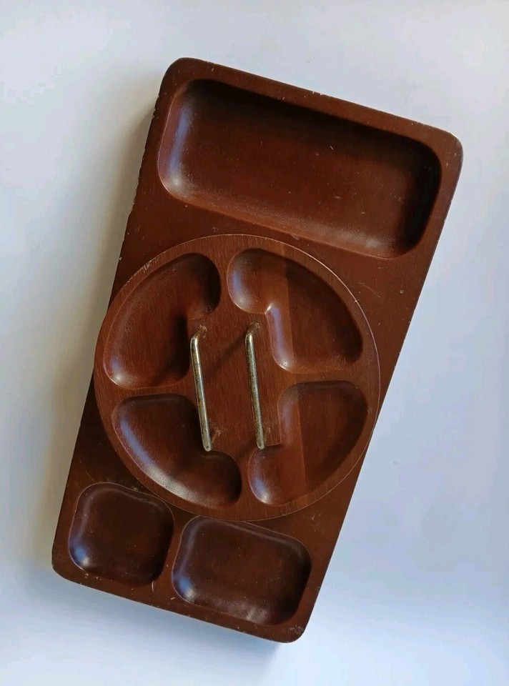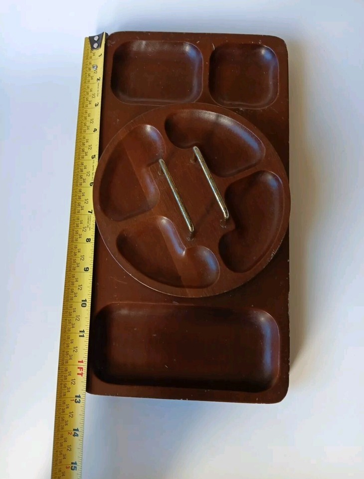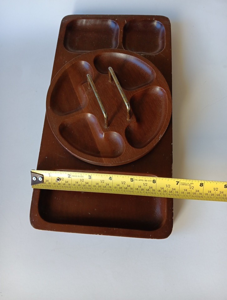 The Lazy Susan Wooden Serving Tray by Shields Mahogany is a vintage piece perfect for serving nuts or mints at any occasion. With its solid pattern and medium size, this rectangle-shaped tray features seven compartments and a mahogany finish that exudes mid-century modern style. The lazy Susan feature allows for easy serving and access to the contents of the tray, making it both practical and stylish for collectors or those looking to add a touch of retro charm to their home decor.Normal wear.