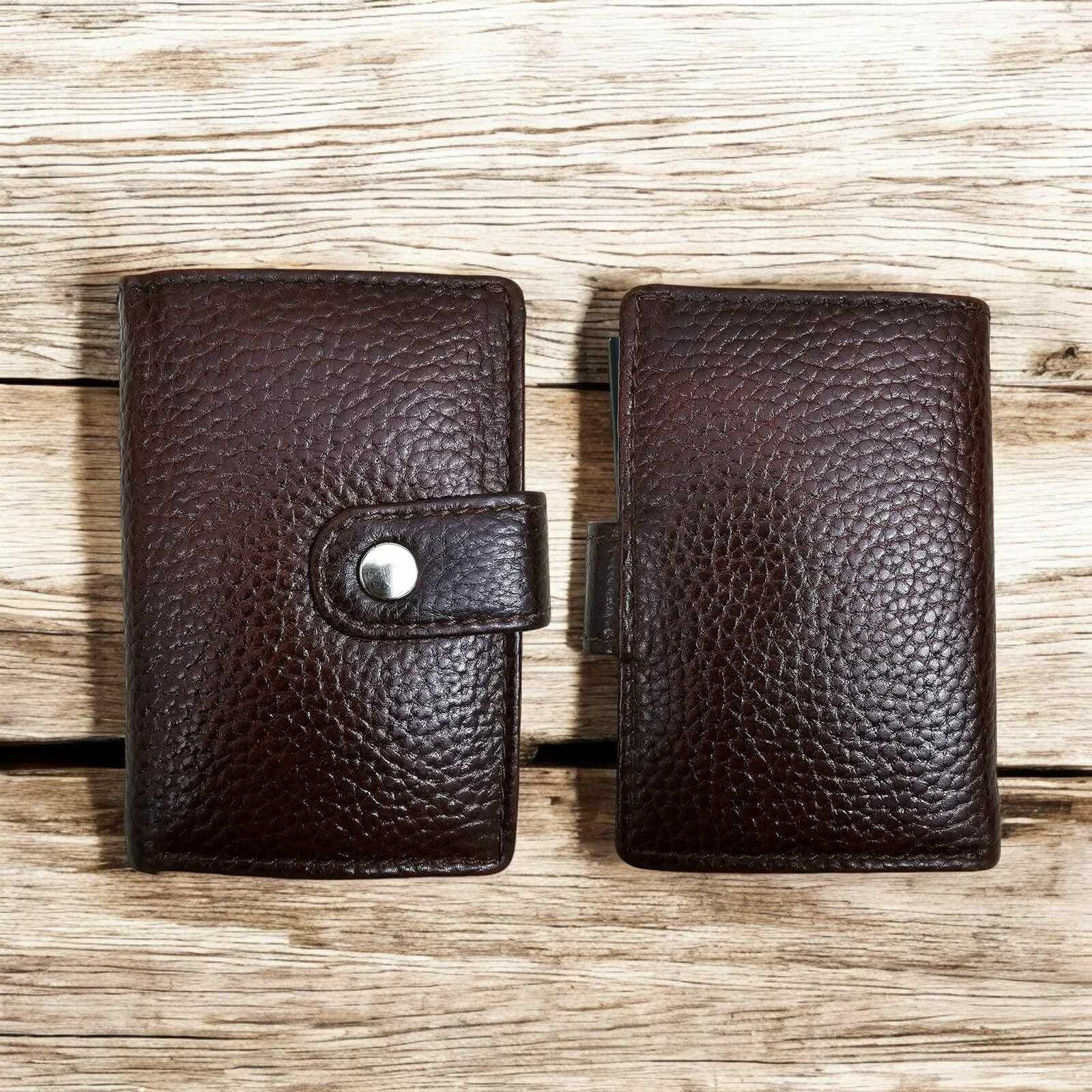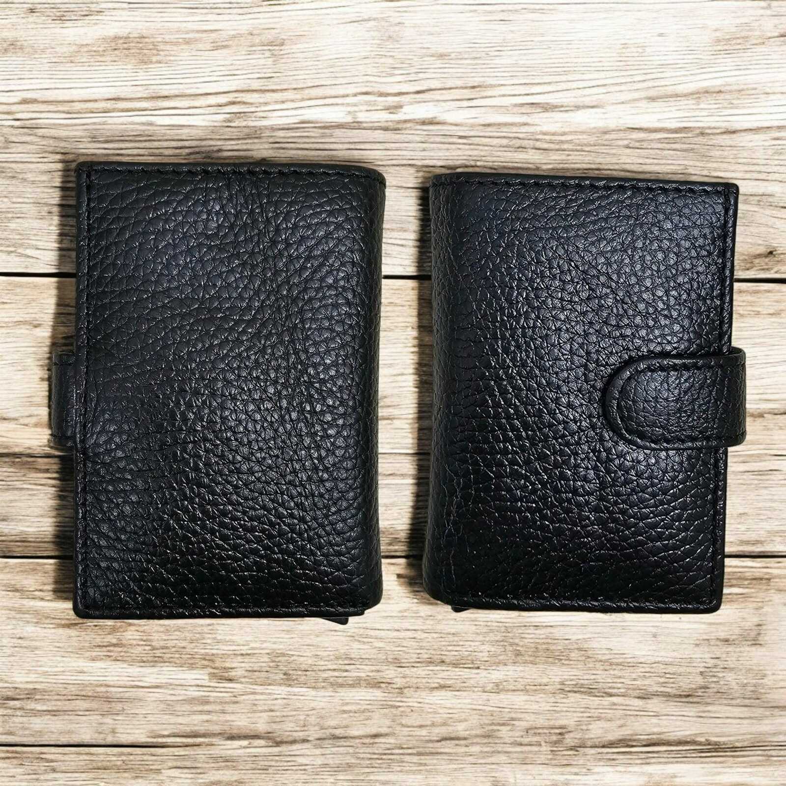 Upgrade your daily essentials with this set of two leather card holders, handcrafted for sophistication and protection. Available in black and brown, each holder features RFID-blocking and a pop?up metal case, combining minimalist design with reliable card security.