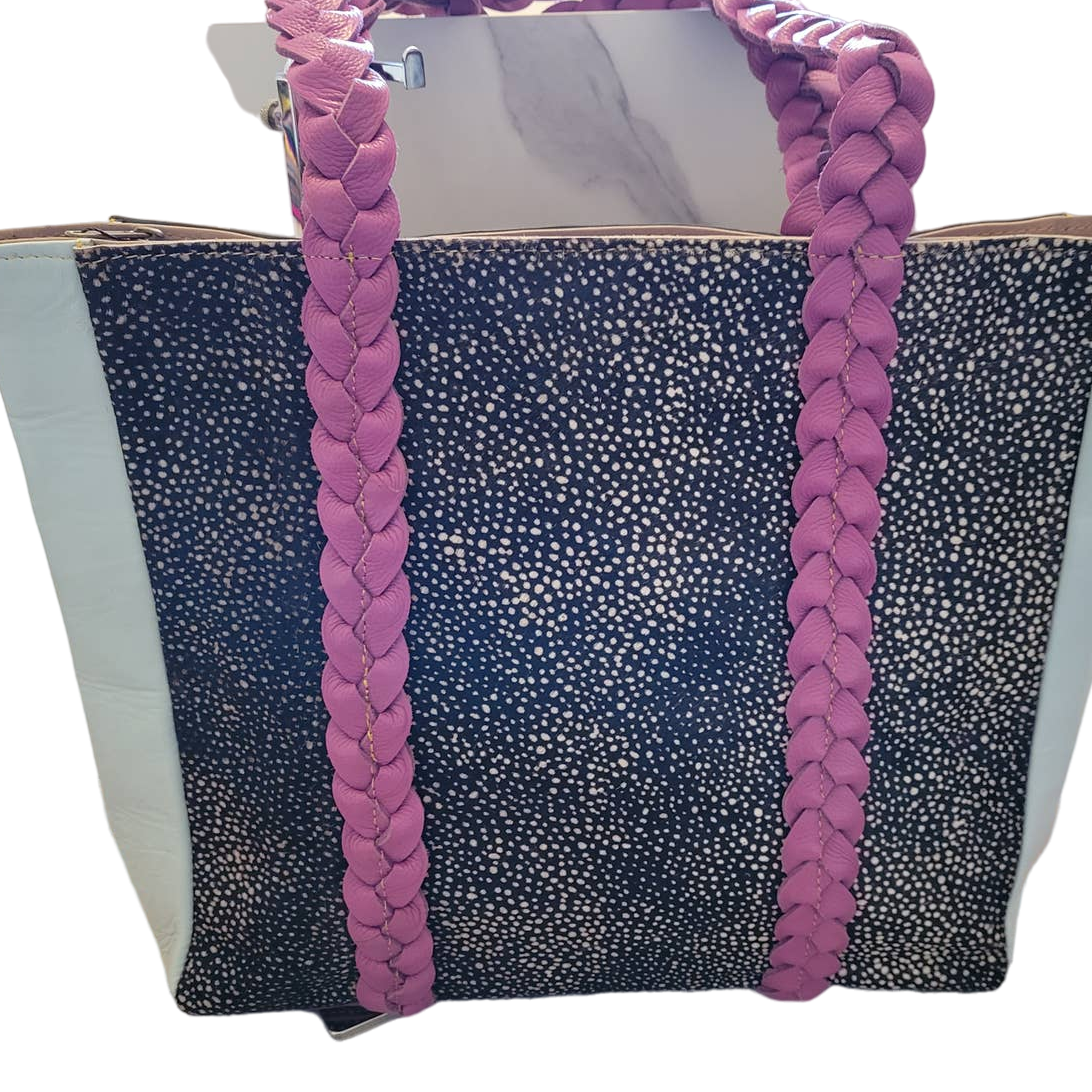 Leather Spotted Hair on Hide Braided Handle Tote Bag Purse Purple Grey