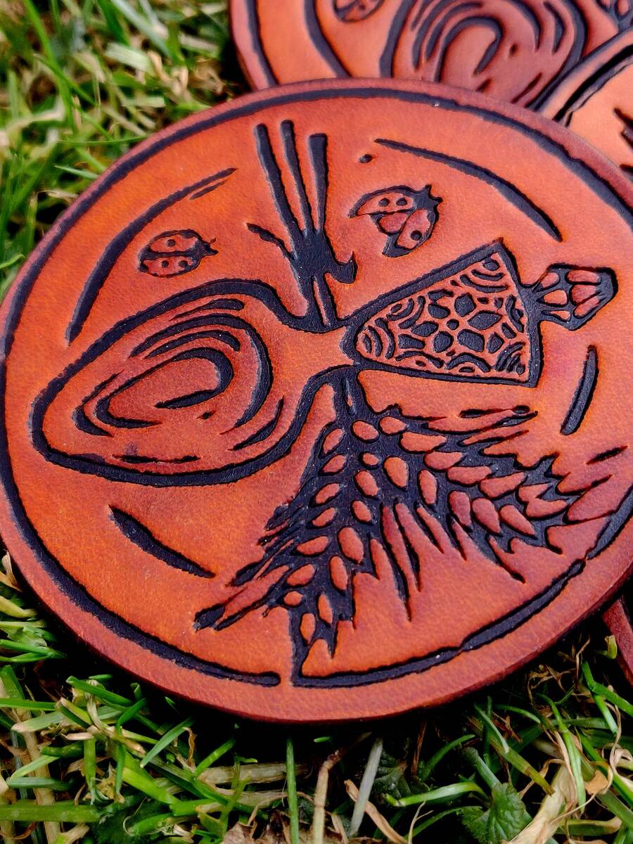 Leather patch, deep pressed patch, Leather coaster, spoon, wheat, and ladybugs p