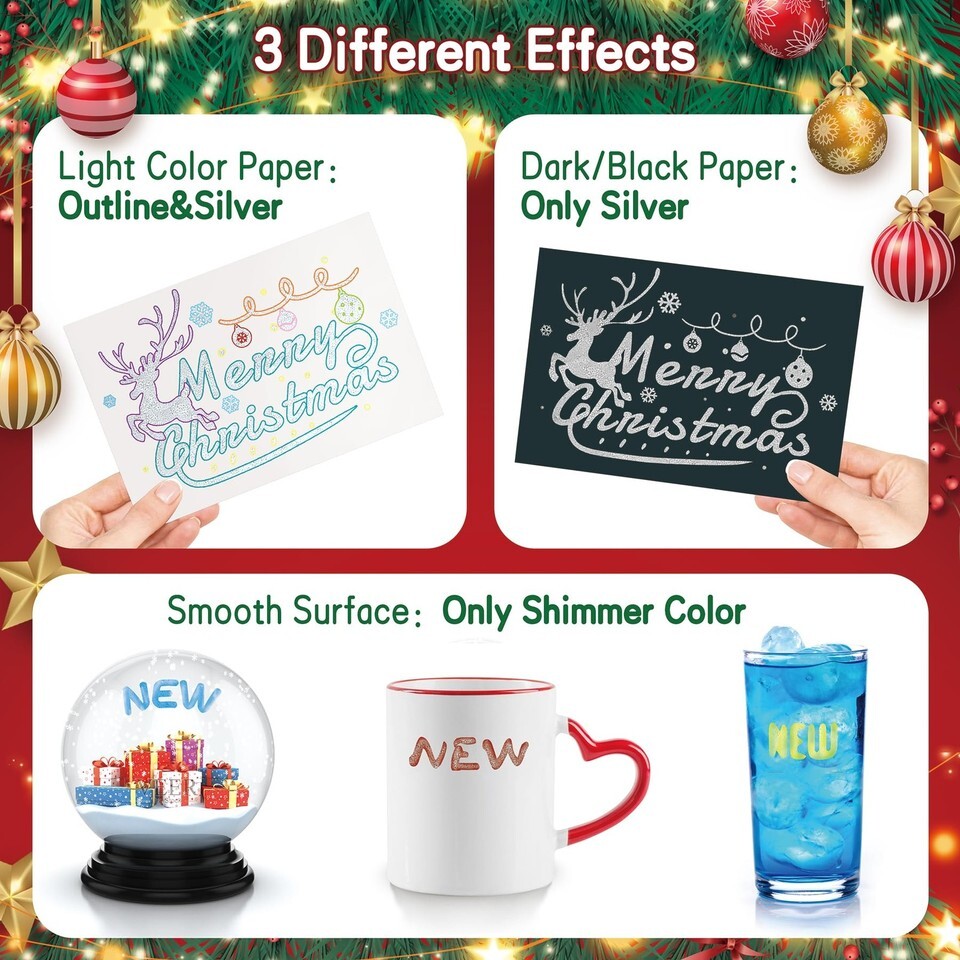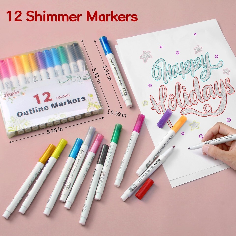 Shimmer Markers: 12 assorted bright colors. Double line outline pens designed with unique technology will automatically produces outlines for you to create a beautiful dual-color effect. It can draw 3 different effects on light colored paper, black paper and smooth surface.