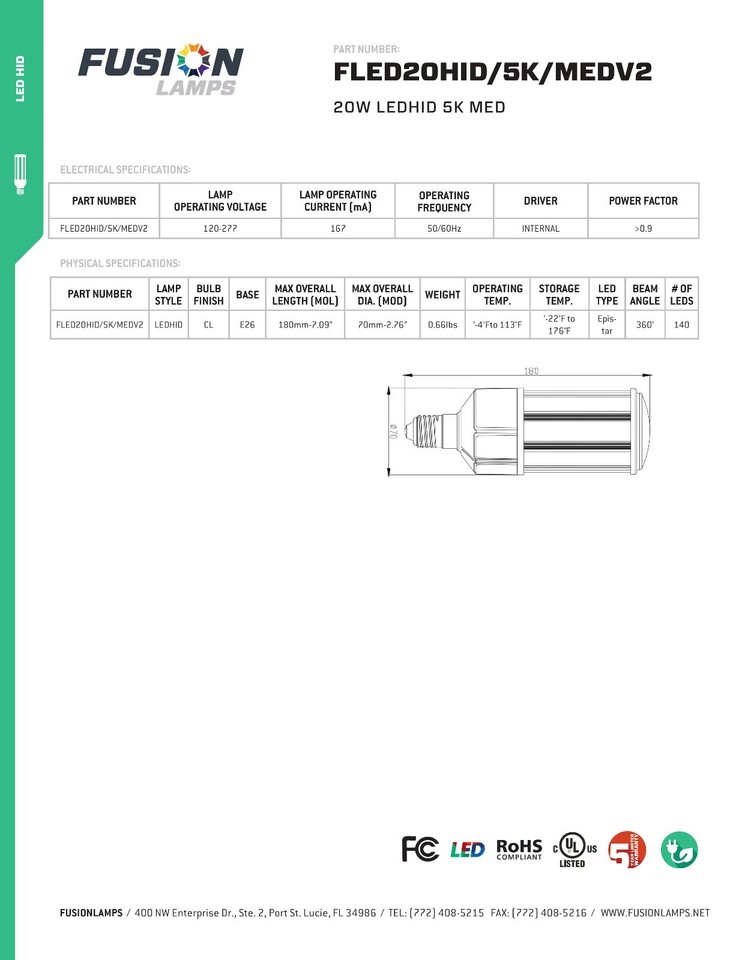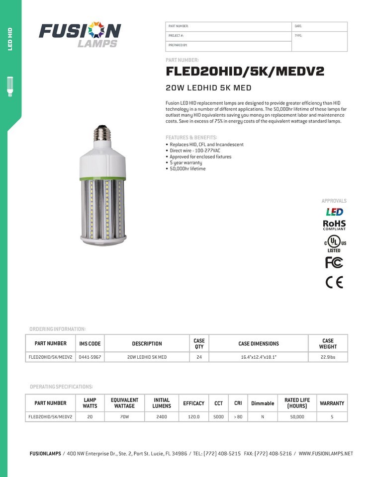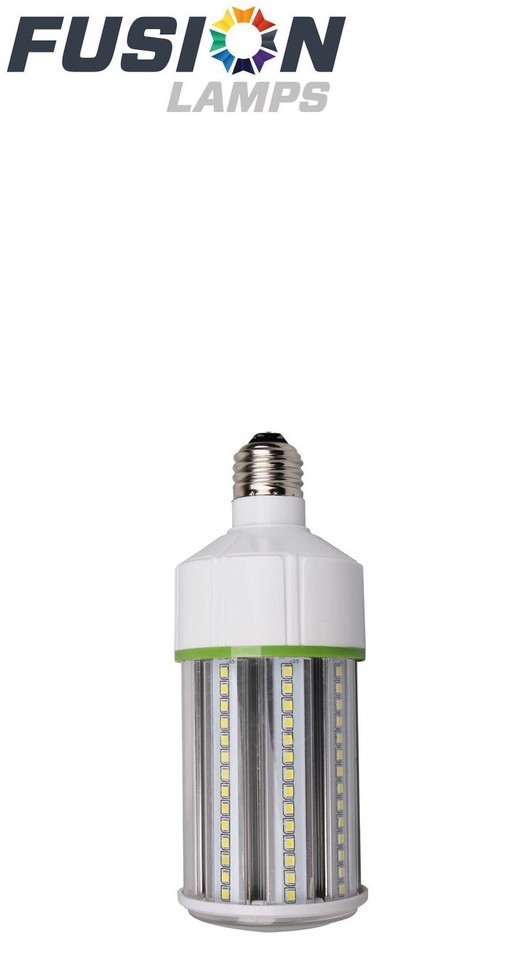 (1) NEW LED HID 20 watt FLED20HID/5K/MEDV2 CORN COB BULB MADE BY FUSION LAMPS CATALOG CODE FLED20HID/5K/MEDV2 STOCK CODE 0441-5967 UPC# 190010005369. THIS 70 watt EQUIVALENT, CONSUMES ONLY 20 watts OF ELECTRICITY. FEATURES ROUND DESIGN WITH E26 STANDARD EDISON BASE (standard light bulb base size), THIS BULB WILL SCREW INTO MOST STANDARD LIGHT BULB LAMPHOLDERS. THIS CORN COB DESIGN LED BULB PROVIDES 2400 LUMENS OF BRIGHT WHITE DAYLIGHT (the equivalent of 70 watts), UNIQUE 360 degree DESIGN PROVIDES BRIGHT DAYLIGHT ALL AROUND PLUS LAMP TO FLOOR, DELIVERS THE EQUIVALENT OF A 70 watt INCANDESCENT BULB AND ONLY USES 20 watts. THIS FUSION BRAND LED BULB IS DESIGNED TO PROVIDE GREATER EFFICIENCY THAN HID TECHNOLOGY IN VARIOUS APPLICATIONS. THE 50,000 HOUR LIFETIME OF TIS LAMP FAR OUTLASTS MANY HID EQUIVALENTS, SAVING YOU MONEY. UL LISTED. YOU WILL
