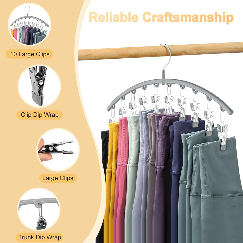 Maximize Closet Space: Our Premium Legging Organizer Hangers are designed to optimize your closet space; they include two-pack hangers; each hanger comes with ten large clips, allowing you to store up to 20 pairs of leggings per hanger, keeping your wardrobe neat and organized.