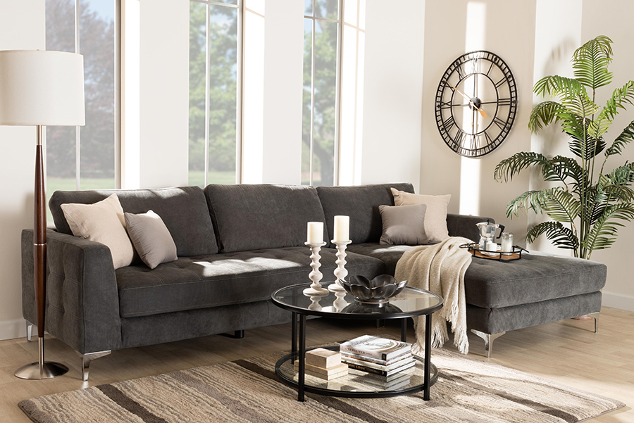 Update a living room with this Legrand modern sofa set. Built with a solid wood and plywood frame and covered with Graymicrofiber upholstery. This sofa can be positioned one of many ways to complete your living room decor.