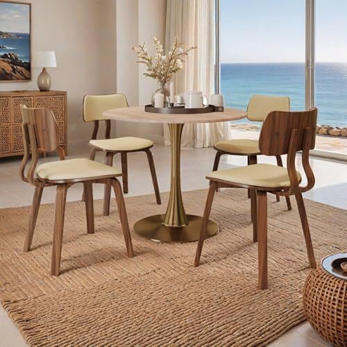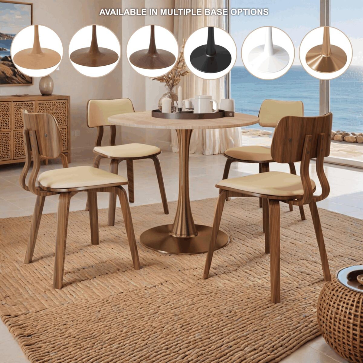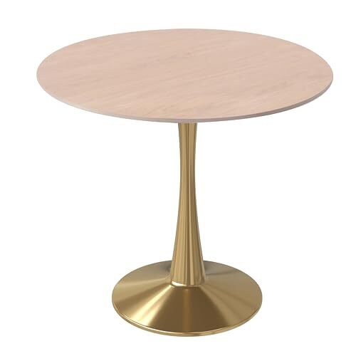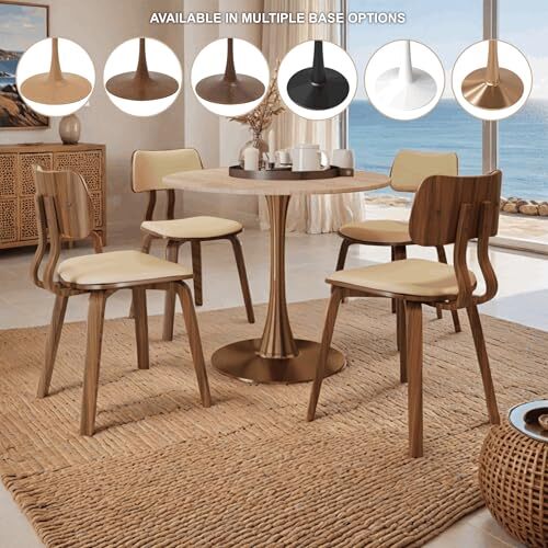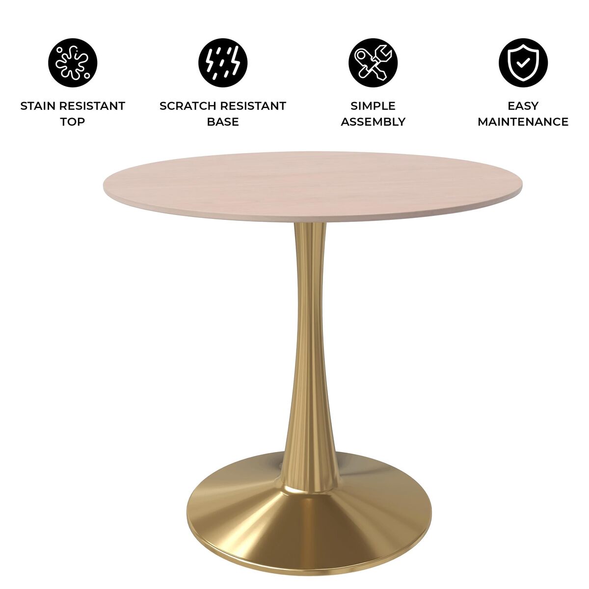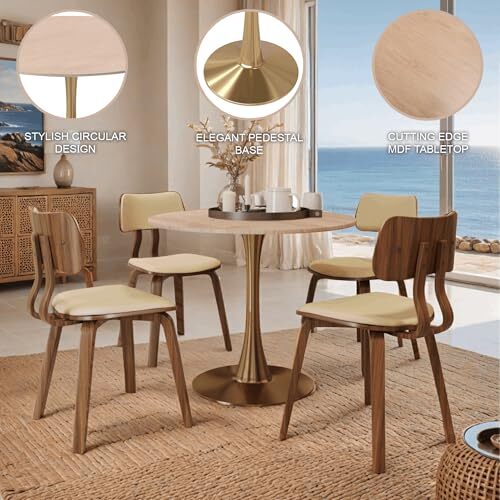 Bullet point: MINIMALIST DESIGN: Offering a minimalist design, the round tabletop encourages an inclusive dining atmosphere conducive to easy conversation. The base featuring a single pedestal, offers a clean and understated appearance, optimizing legroom and seating flexibility.