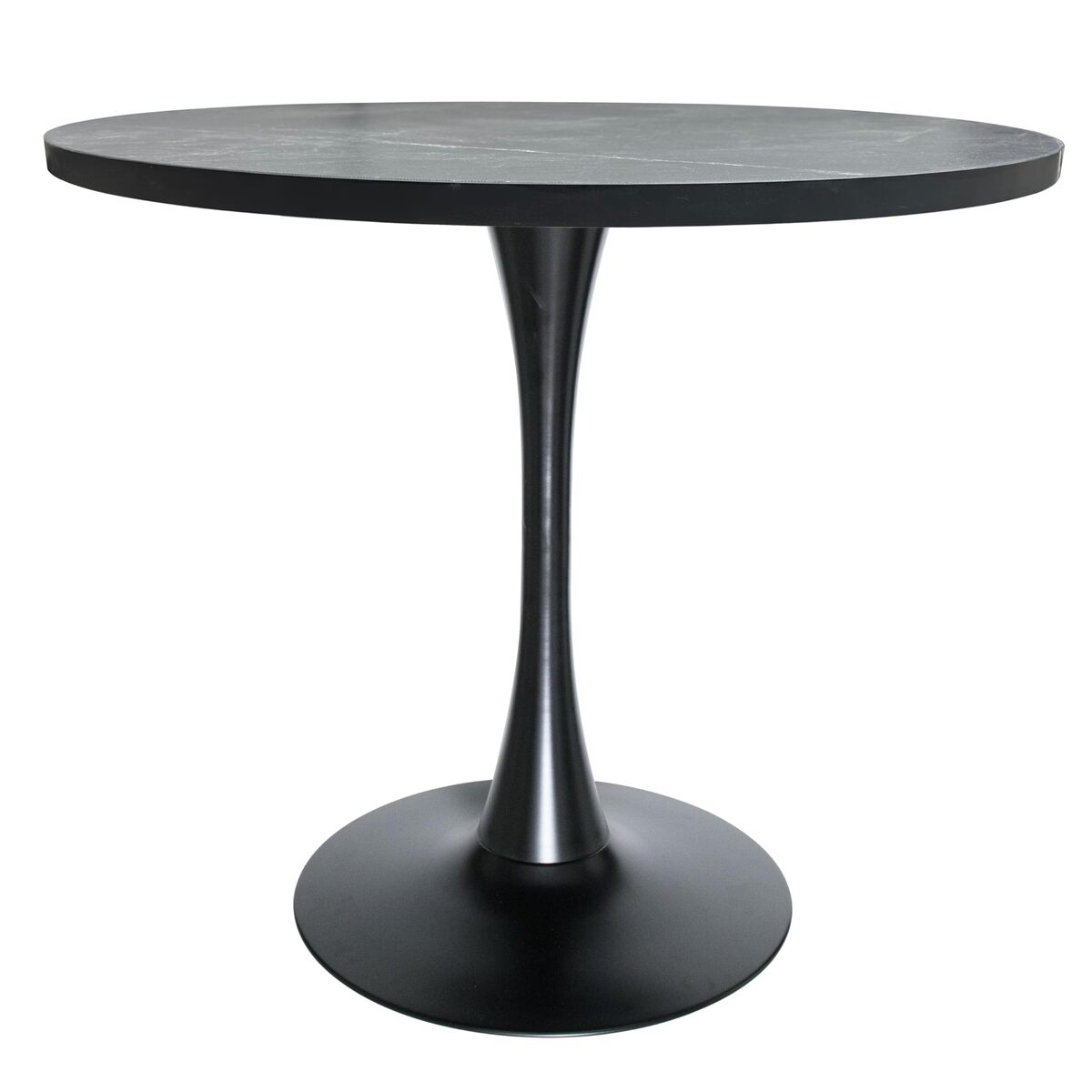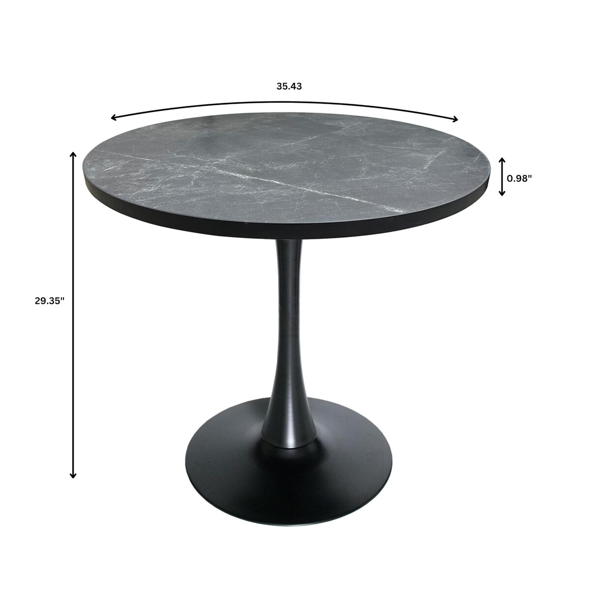 The circular design of this dining table embodies contemporary style, imparting a chic and refined aesthetic that harmonizes with any modern setting. Versatile in nature, this round dining table effortlessly enhances the ambiance of any room. The tabletop is constructed from MDF wood, a state-of-the-art material valued for its resilience and refined aesthetic. MDF embodies a perfect balance of style and practicality, boasting an attractive appearance. Sporting a sleek iron base, this modern round dining table boasts a stable foundation for its circular tabletop, marrying functionality with style seamlessly. The pedestal base is a single column that supports the tabletop, creating a sleek and streamlined look that is both elegant and modern. The pedestal base provides stability and balance to the table. Measuring 29" H x 35.43" W x 35.43" D, this Round Dining Table is the perfect addition to any space that matches your personal style and complements your existing décor. A quick spot clean with a dry cloth is all that is required to keep the dining table free from dust, spills, and stains. This easy maintenance routine allows you to enjoy the beauty of the table without the hassle of extensive cleaning. The package includes comprehensive instructions along with all the necessary hardware. With minimal effort, you can have this stunning dining table assembled and ready for use