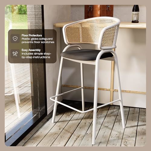 Wicker Backrest with a durable plastic frame. Smooth Leather Seat with high-density sponge filling for comfort. Heavy-Duty Stainless Steel Frame supports up to 250 lbs. Premium Powder-Coated Finish for scratch and corrosion resistance. Built-In Footrest for added support and comfort. Plastic Glides to protect floors and ensure smooth movement. Easy Assembly with clear instructions included. Versatile Design perfect for kitchen islands, bars, and more.