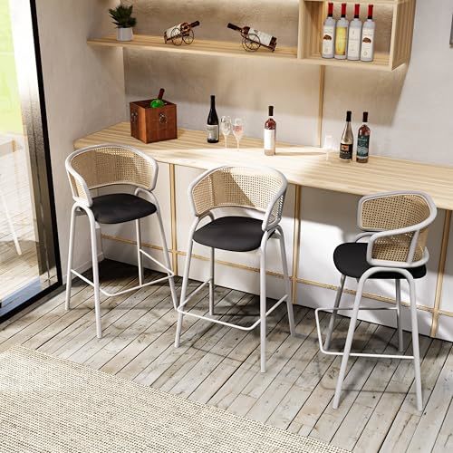 The bar stool features a low-back wicker backrest with a plastic back frame that enhances its durability. The wicker pattern is designed to be breathable, offering comfort and adding to its distinctive visual appeal. The structure is crafted to provide reliable support and a refined, airy design. The seat features a smooth leather surface with a high-density sponge filling. The leather provides a refined and soft texture, and the sponge filling ensures consistent support and comfort during extended sitting. The kitchen stool is built with a durable stainless steel frame that supports up to 250 lbs. The strong construction ensures reliable stability and dependable performance, making it suitable for a variety of users. The frame is finished with a premium powder coating that increases resistance to scratches, corrosion, and everyday wear. The coating also gives the surface a refined matte finish, adding a touch of sophistication to the overall design. The counter stool is equipped with a built-in footrest that is carefully positioned to provide additional support for the legs. The design promotes a relaxed sitting posture and reduces pressure, contributing to a more comfortable seating experience. The bar stool features plastic glides that protect flooring from scratches and scuffs. These glides also allow for smooth movement and provide enhanced stability on a variety of floor types, including hardwood, tile, and laminate. Designed for quick and straightforward assembly, with clear instructions included. Its versatile design makes it suitable for use at kitchen islands, counters, or bar areas, seamlessly fitting into different spaces.