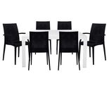Transform your outdoor space with this 7-piece modern patio dining set that includes 4 dining chairs, 2 armchairs, and a bistro table which is durable and weather-resistant materials make it perfect for entertaining guests or relaxing outdoors. This 7-piece modern patio dining set is crafted from sturdy Polypropylene, making it durable, stylish, and comfortable seating with its sleek look and easy-to-clean surface, it's a great addition to any patio or garden. The modern dining chairs can be conveniently stacked and stored, making them save space when not in use. Elevate your outdoor dining experience with this modern 7-piece patio dining set featuring an attractive weave design. Add a touch of elegance and style to your patio with this must-have dining set. This modern 7-piece patio dining set is designed for both style and functionality as it comes complete with plastic cap floor protectors to prevent scratches and damage to your flooring. This 7-piece modern patio dining set feature to be lightweight it’s easy to move around making them a versatile addition to any patio or outdoor space. The Outdoor Dining Set is easy to assemble, and you can have it ready for use in no time. Instructions and assembly tools are included.