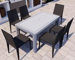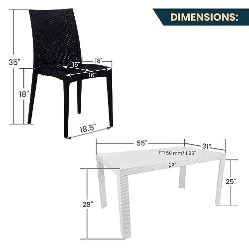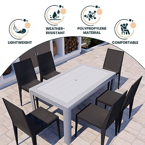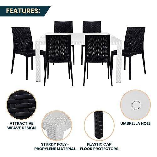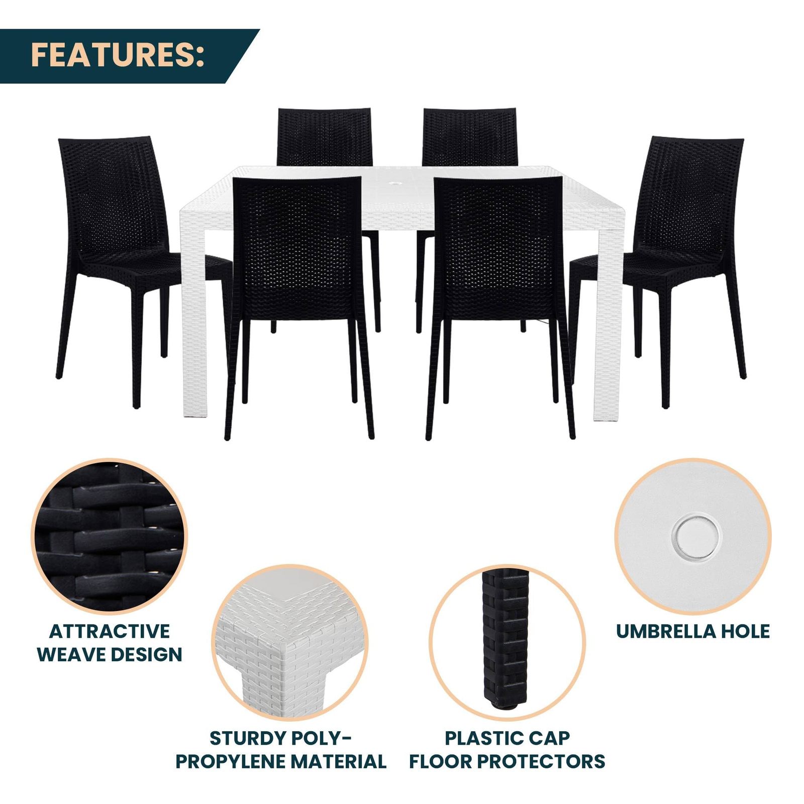 Transform your outdoor space with this 7-piece modern patio dining set that includes 6 dining chairs and a bistro table which is durable and weather-resistant materials making it perfect for entertaining guests or relaxing outdoors. This 7-piece modern patio dining set is crafted from sturdy Polypropylene, making it durable, stylish, and comfortable seating with its sleek look and easy-to-clean surface, it's a great addition to any patio or garden. The modern dining chairs can be conveniently stacked and stored, making them save space when not in use. Elevate your outdoor dining experience with this modern 7-piece patio dining set featuring an attractive weave design. Add a touch of elegance and style to your patio with this must-have dining set. This modern 7-piece patio dining set is designed for both style and functionality as it comes complete with plastic cap floor protectors to prevent scratches and damage to your flooring. This 7-piece modern patio dining set feature to be lightweight it’s easy to move around making them a versatile addition to any patio or outdoor space. The Outdoor Dining Set is easy to assemble, and you can have it ready for use in no time. Instructions and assembly tools are included.