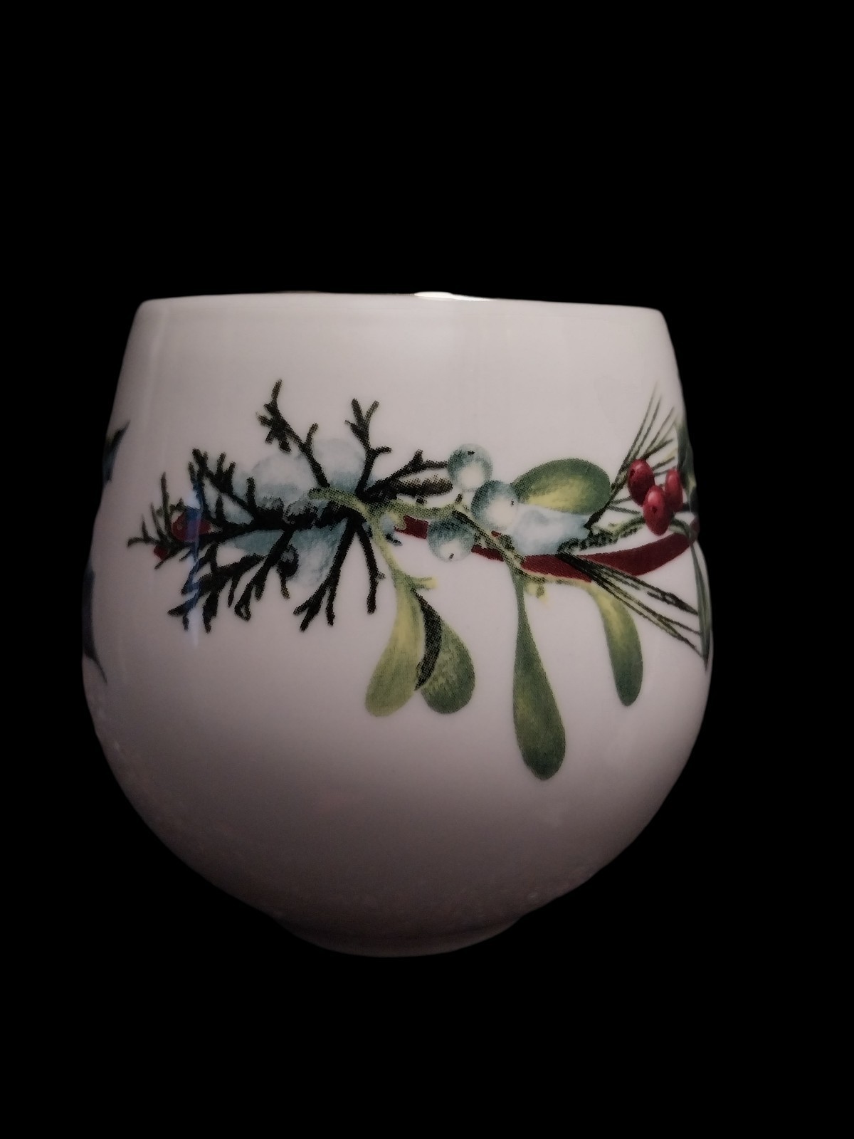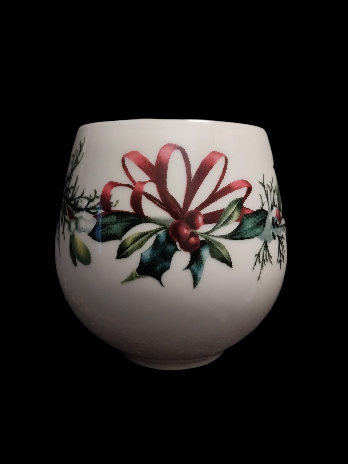 The Lenox Say It With Silk Collection Mini Cachepot/Votive featuring Green Holly and Red berries is a traditional style candle holder perfect for the Christmas season. Made of glossy porcelain, this small round cachepot is decorated with a holly pattern, adding a festive touch to any room. Suitable for a mini candle. With its classic design and seasonal theme, this candle holder from the late 20th century is a charming addition to any home decor collection. Approx. 3.5" x 3". Sorry no box.