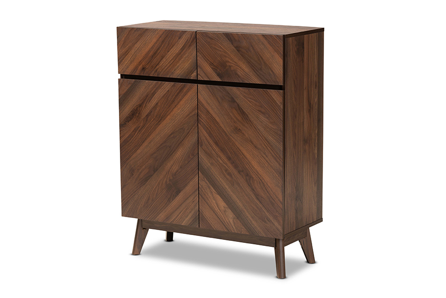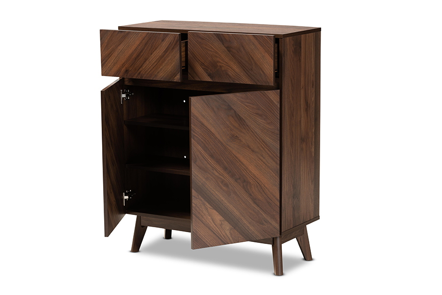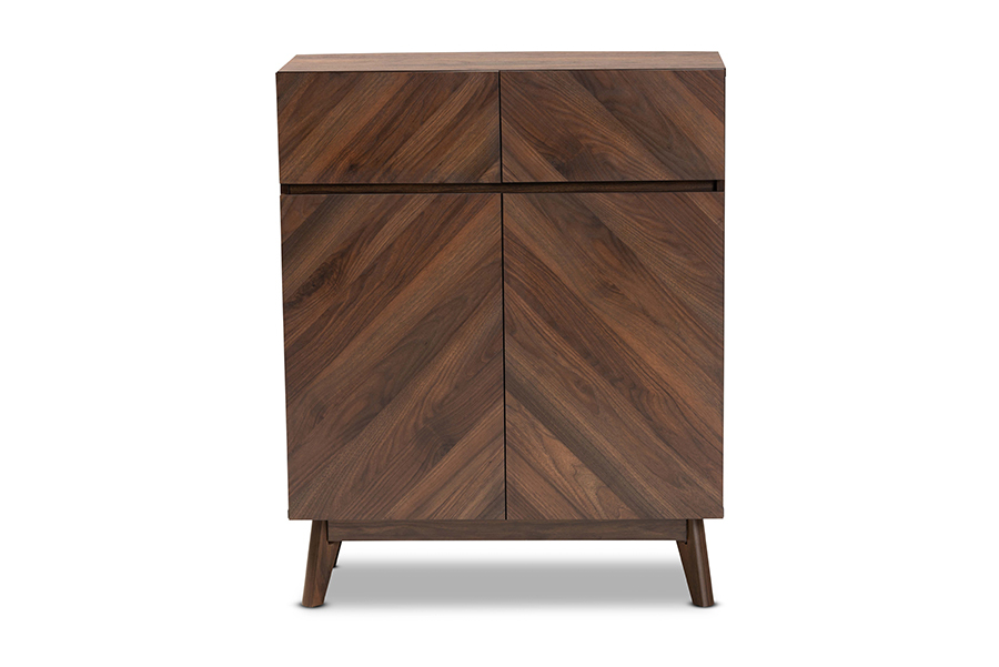 Shape the layout of your home with the refined, energetic style of the Leryn shoe cabinet. Made in Malaysia, this cabinet exudes natural warmth with its walnut brown finished wood frame. Two drawers offer convenient storage for outdoor necessities while three shelves behind the doors provide space for about twelve pairs of shoes, depending on size. Requiring assembly, the Leryn exhibits a dynamic wood grain to convey a robust visual texture. With a sleek, streamlined design, the Leryn shoe cabinet is a fantastic complement to the modern home.