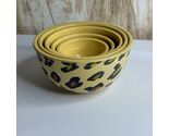 Keywords: measuring cups, bowls, kitchenware, leopard print, animal print, yellow bowls, nesting bowls, melamine bowls, baking accessories, kitchen decor, vintage kitchen, retro kitchen, cute kitchen