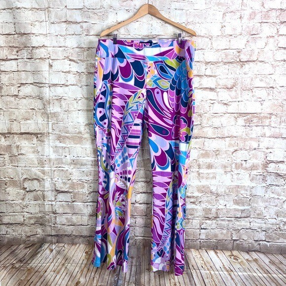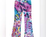 Lesley Evers Erika Pant in Shakalaka Lilac Size 2X - flared print pants with a groovy 70's vibe. Slim flared pant, pull on styling. 95 cotton 5 spandex