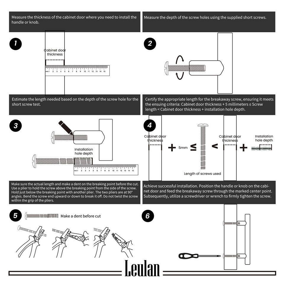 Two Length Screws: To fit most cabinets, each gold knob matches 1'' and 1.77'' M4 stanard slub screws, you can use pliers cut it off if screw long for cabinets. Also, if you need longer screws please contact us